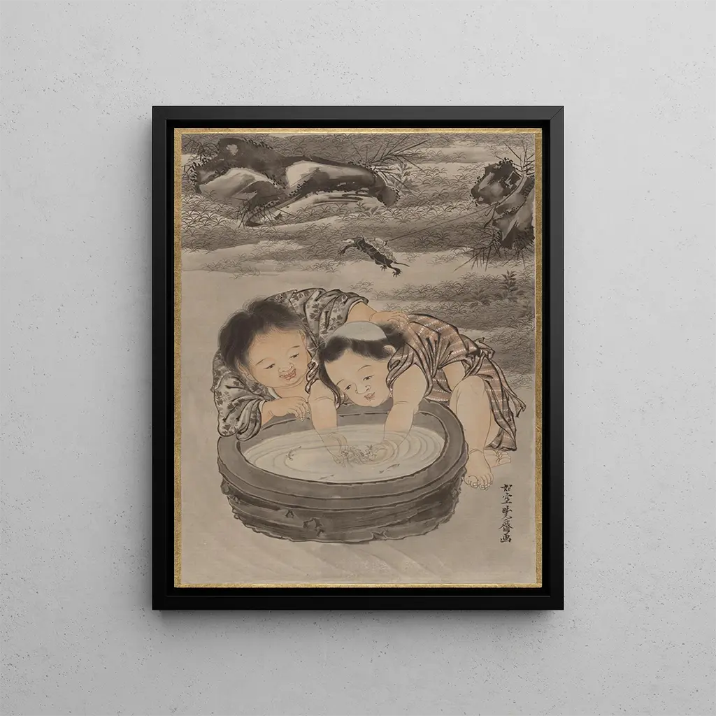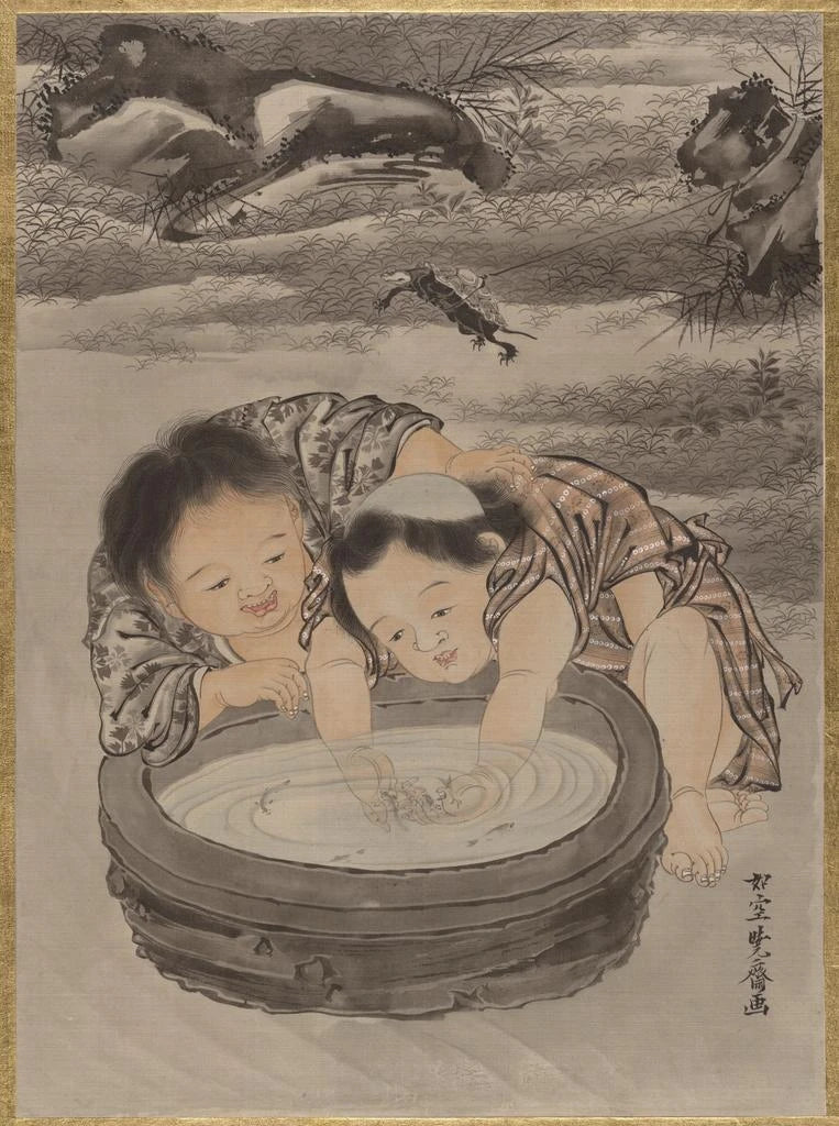 Dwoje dzieci bawiących się z rybkami złotymi - Kawanabe Kyōsai