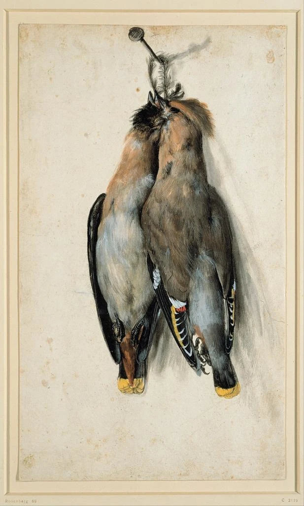 Dans cette œuvre captivante, Lucas Cranach l'Ancien nous plonge dans une scène où deux jaseurs de Bohême, figés dans un moment tragique, évoquent la beauté éphémère de la vie. Les couleurs vives, mêlant des nuances de bleu et de vert, créent un contraste saisissant avec la représentation des oiseaux, dont les plumes délicates sont rendues avec une précision remarquable. La technique de Cranach, caractérisée par des contours nets et un éclairage subtil, confère à cette toile une atmosphère à la fois mélancolique et contemplative, invitant le spectateur à réfléchir sur le cycle de la vie et de la mort.