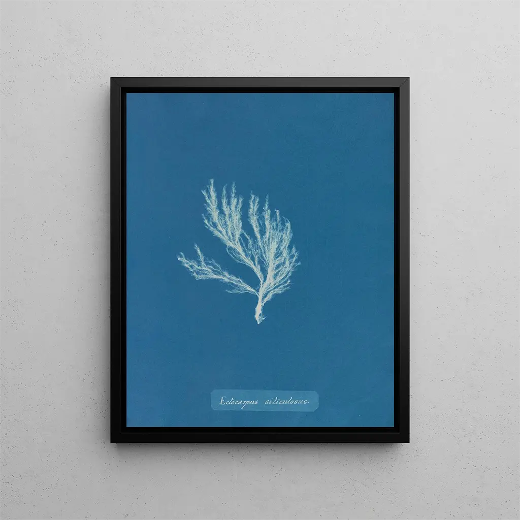 Styl Anny Atkins charakteryzuje się minimalistyczną elegancją, gdzie każdy szczegół jest starannie zaplanowany, aby podkreślić wewnętrzne piękno jej tematów. W "Ectocarpus siliculosus" organiczne kształty algi wyróżniają się na tle błękitnego tła, tworząc uderzający kontrast, który przyciąga wzrok i pobudza wyobraźnię. Cyjanotypia, z jej odcieniami niebieskiego, przywołuje atmosferę zarówno spokojną, jak i tajemniczą, przenosząc widza do świata, gdzie natura i sztuka się przenikają. To dzieło nie ogranicza się do prostego przedstawienia; jest także eksploracją tekstur i motywów, ukazując bogactwo morskiej różnorodności biologicznej. Każda reprodukcja staje się otwartym oknem na świat często pomijany, zaproszeniem do ponownego odkrywania piękna elementów otaczającej nas przyrody.
