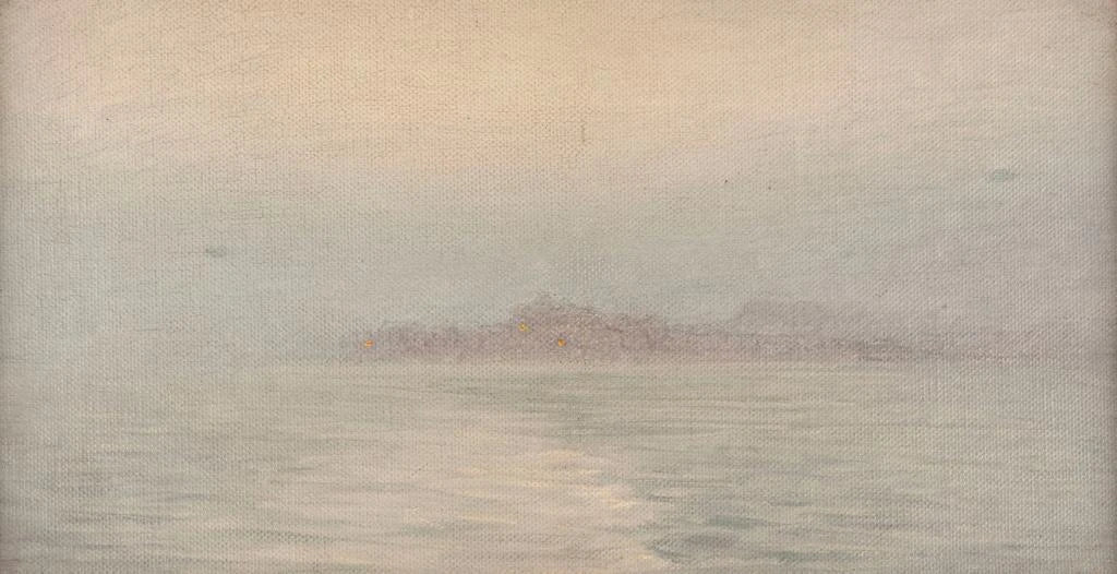 To urzekające dzieło, "Efekt mgły nad morzem", wywołuje eteryczną atmosferę, w której odcienie niebieskiego i szarego mieszają się, tworząc wrażenie tajemniczości. Technika impresjonistyczna użyta przez artystę pozwala koloryzmowi delikatnie się przenikać, ożywiając zamglone morze. Pociągnięcia pędzla, zarówno lekkie, jak i płynne, wydają się uchwycić ruch fal, jednocześnie sugerując rozproszoną światłość, jakby słońce próbowało przebić się przez mgłę. To obraz zachęca do spokojnej kontemplacji, przenosząc widza do świata, w którym natura powoli się odsłania.