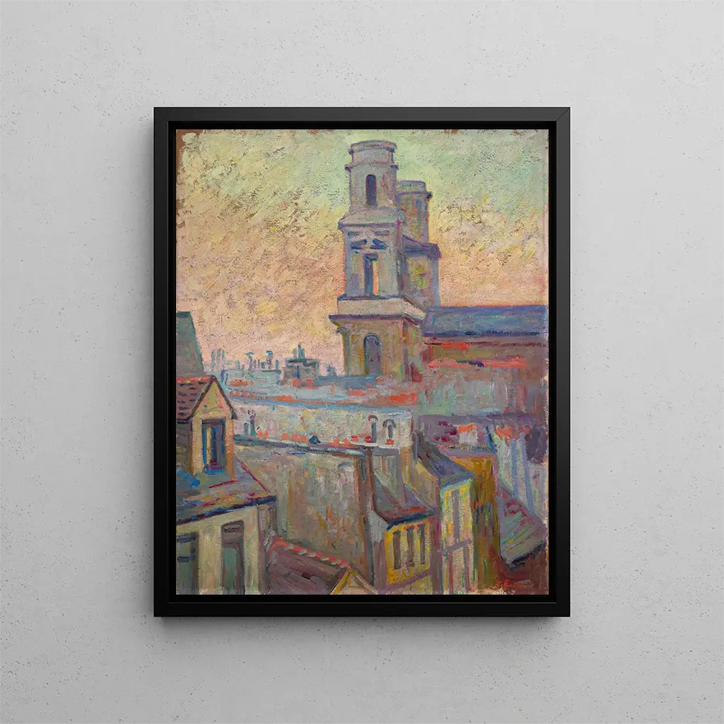 Guillaumin, wybitna postać ruchu impresjonistycznego, wyróżnia się odważnym podejściem do koloru i światła. W tym dziele prezentuje bogatą paletę, w której odcienie niebieskiego, żółtego i różowego splatają się, by oddać jasność paryskiego nieba. Jego styl, jednocześnie swobodny i strukturalny, pozwala na unikalną interpretację architektury kościoła, zachowując majestat jego linii. Sposób, w jaki uchwycił odbicia światła na kamiennych fasadach, a także cienie rzucane przez okoliczne drzewa, świadczy o niezwykłej technicznej biegłości. Każdy element obrazu zdaje się drgać, jakby sam kościół ożywał własnym życiem. Kompozycja, zarówno zrównoważona, jak i dynamiczna, zachęca wzrok do spaceru po obrazie, odsłaniając nieoczekiwane szczegóły przy każdej kontemplacji.