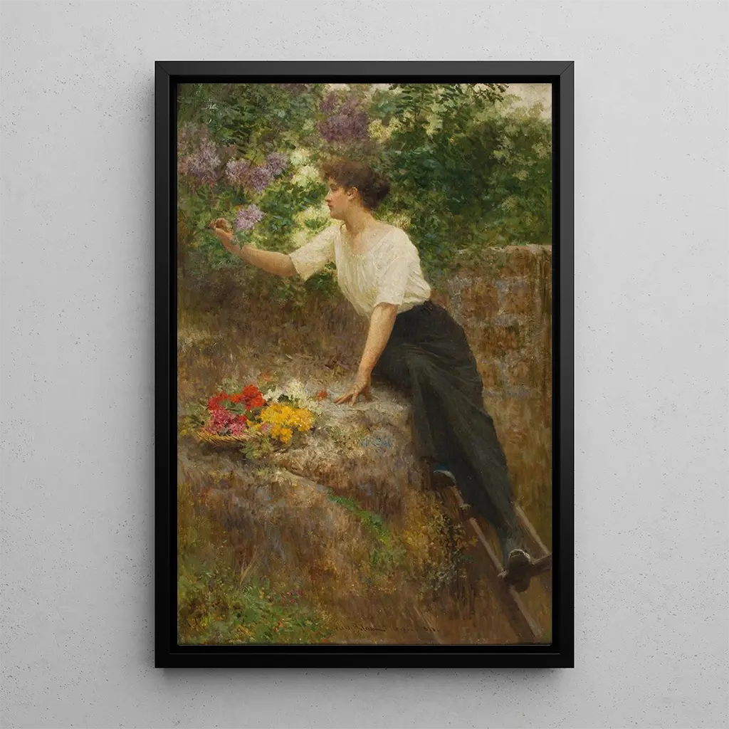 Płótno "W maju" autorstwa Vlaho Bukovaca przywołuje delikatność dnia wiosny, kiedy światło tańczy na twarzach i kwiatach. Kolory pastelowe, łączące odcienie delikatnej zieleni i różu, tworzą uspokajającą i radosną atmosferę. Kompozycja, skoncentrowana na młodej kobiecie w lekkiej sukni, natychmiast przyciąga wzrok. Jej spokojny i kontemplacyjny wyraz twarzy zachęca do marzeń, podczas gdy otaczający krajobraz, bogaty w detale florystyczne, wzmacnia to uczucie spokoju. To dzieło, jednocześnie intymne i pełne życia, oddaje istotę sezonu wiosennego.