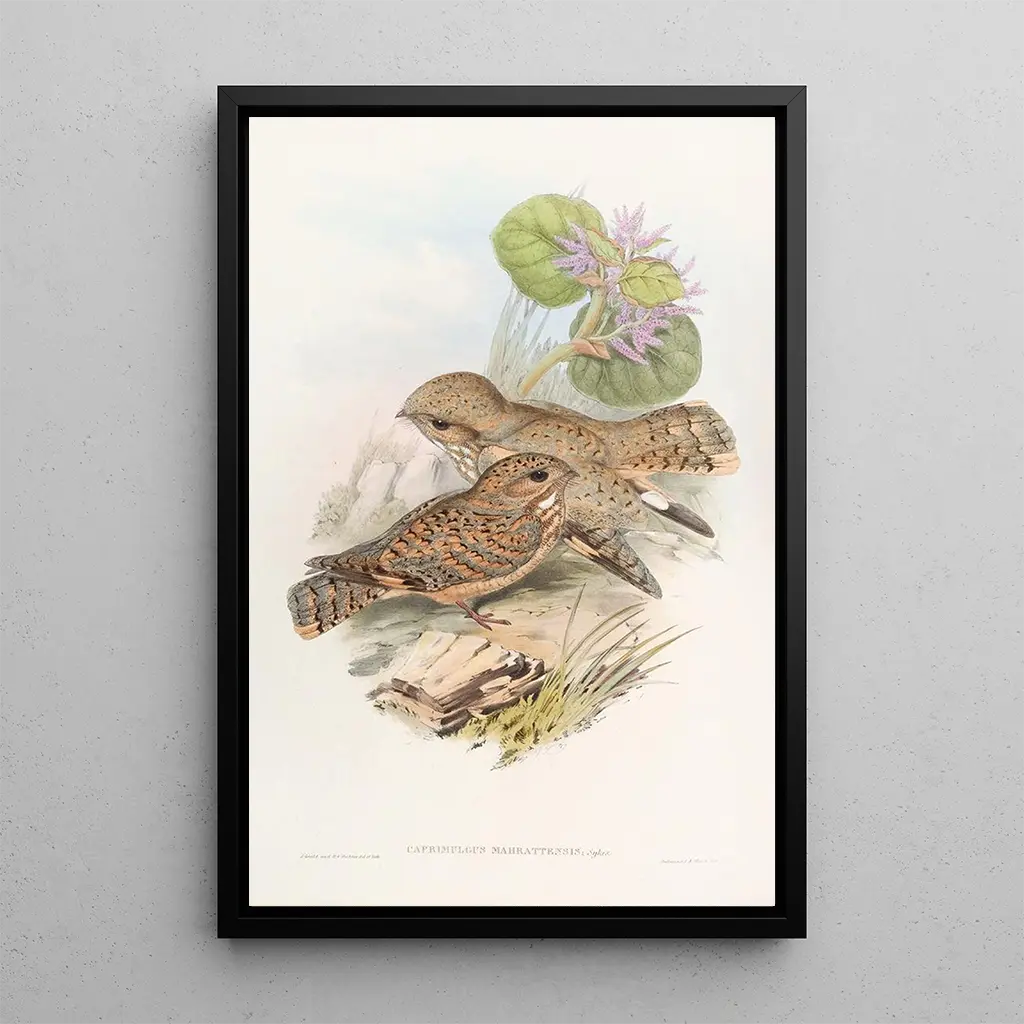 Engoulevent Mahratta, uchwycony przez artystyczny obiektyw Johna Goulda, prezentuje się jako cud natury. Jego delikatne upierzenie, łączące odcienie brązu i złota, przywołuje ciepło egzotycznych krajobrazów. Kompozycja tego dzieła jest starannie zaplanowana, podkreślając elegancję ptaka w jego naturalnym środowisku. Technika akwareli, użyta z mistrzostwem, nadaje mu atmosferę lekkości i poezji, zachęcając widza do zachwytu nad pięknem fauny. Każdy szczegół, od piór po żywe oczy, zdaje się ożywać, tworząc intymną więź między artystą a jego motywem.