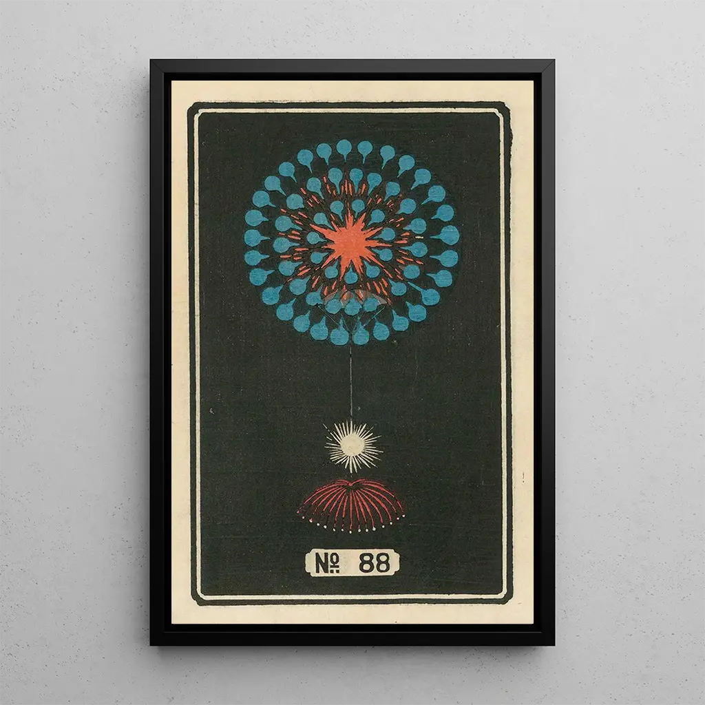 W tej reprodukcji dzieła "Nocne pokazy fajerwerków nr 88" Jinta Hirayama przenosi nas w świetlny spektakl, gdzie kolory wybuchają z rzadką intensywnością. Odcienie niebieskiego, czerwonego i złotego harmonijnie się łączą, tworząc świąteczną i magiczną atmosferę. Technika artysty, łącząca akwarelę i tusz, ożywia każdy fajerwerk, czyniąc je niemal namacalnymi. Eksplozje światła zdają się tańczyć na płótnie, przywołując letnią noc, podczas której pozwalamy się porwać pięknu ulotnych fajerwerków.