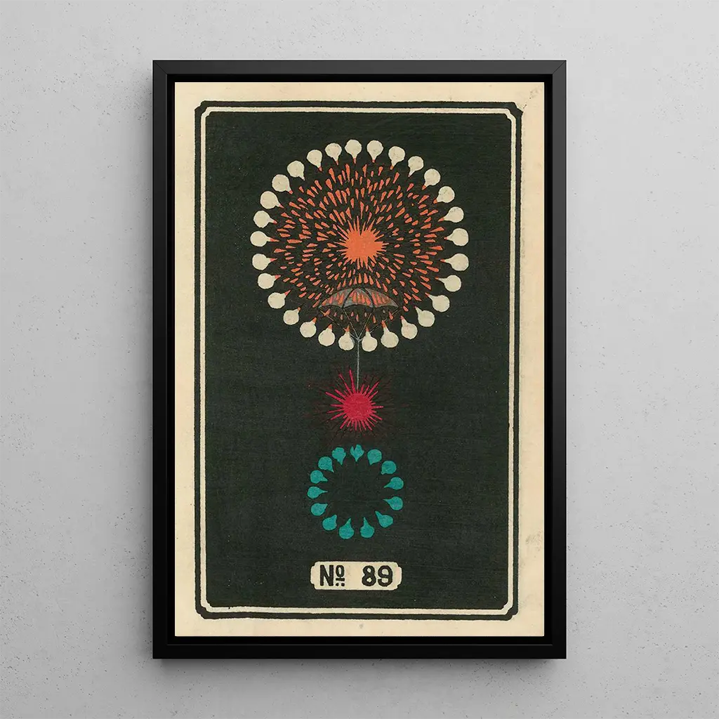 Druk artystyczny "Nocne pokazy fajerwerków nr 89" przenosi nas do świata, w którym noc rozświetla się tysiącem świateł. Jinta Hirayama opanował sztukę uchwycenia ruchu i światła, oferując spektakularną wizję wybuchających fajerwerków na niebie. Żywe kolory, od jaskrawoczerwonych po głębokie odcienie niebieskiego, łączą się, tworząc świąteczną i radosną atmosferę. Technika artysty, łącząca elementy tradycyjne i nowoczesne, nadaje tej pracy unikalną głębię, zachęcając widza do podziwiania tego efemerycznego spektaklu.