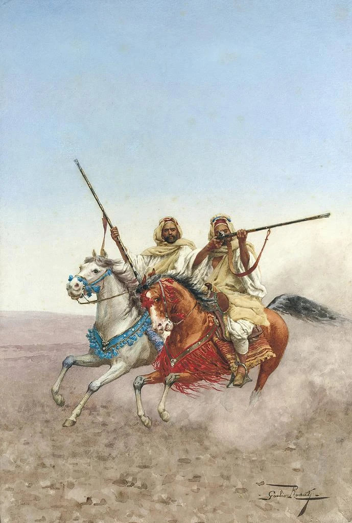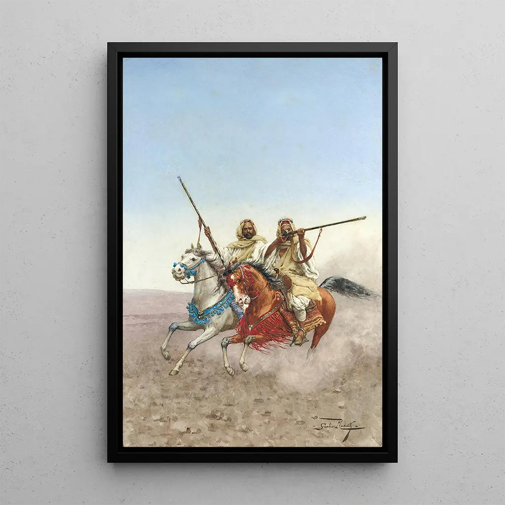 Giulio Rosati, włoski malarz XIX wieku, jest szczególnie znany ze swoich druk artystyczny orientalizujących, które uchwycają piękno i egzotykę kultur orientalnych. Jego kariera była naznaczona serią podróży, które głęboko wpłynęły na jego sztukę. Rosati umiał wprowadzić elementy kultury arabskiej i północnoafrykańskiej do swoich kompozycji, zachowując jednocześnie wyrafinowaną technikę. Jego styl, charakteryzujący się żywymi kolorami i drobiazgowymi detalami, uczynił go ikoną orientalizmu, ruchu artystycznego, który fascynował Europę tamtych czasów.