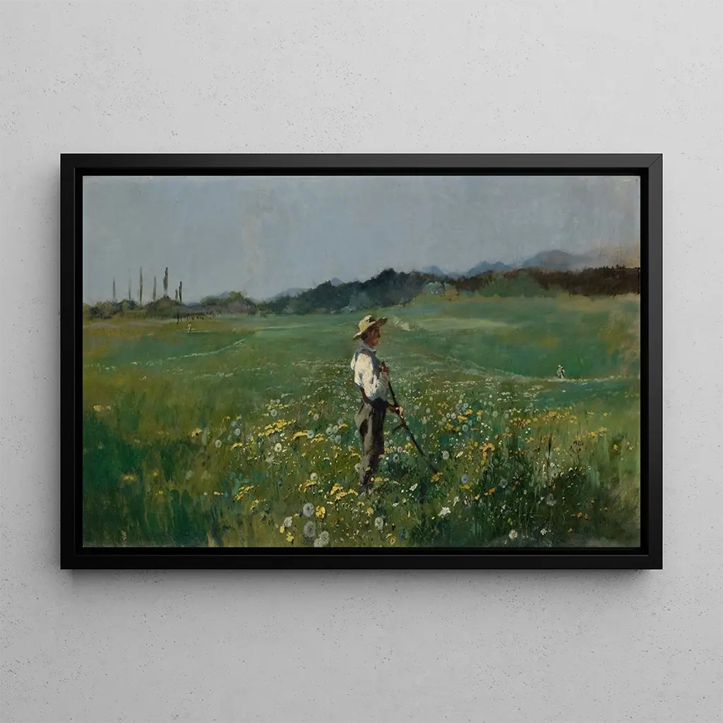 W tym druk artystyczny zatytułowany "Faucheur dans un pré fleuri", artysta Frank Buchser z wielką delikatnością ukazuje piękno świata wiejskiego. Obraz prezentuje paletę żywych kolorów, gdzie jaskrawe zielenie pól łączą się z złotymi akcentami kwiatów. Technika oleju na płótnie pozwala oddać teksturę roślinności i światło słoneczne przenikające przez liście. Atmosfera emanująca z dzieła wywołuje głęboką harmonię, zachęcając widza do zanurzenia się w ten moment ciężkiej pracy, jednocześnie celebrując piękno otaczającej natury.