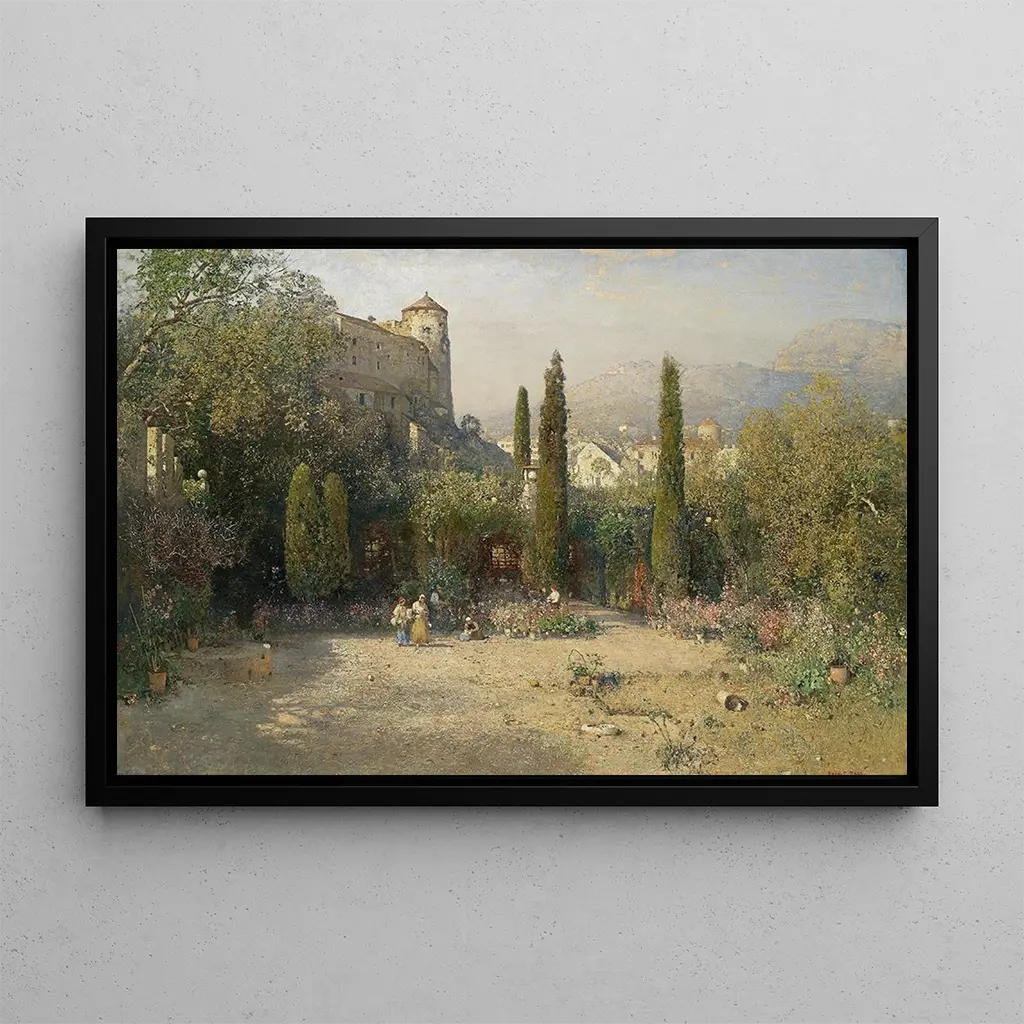 La toile "Fête de jardin dans la vallée de l'Adige" de Robert Russ évoque une atmosphère joyeuse et vibrante, où la nature et l'humanité se rencontrent dans une harmonie parfaite. Les couleurs éclatantes, allant des verts luxuriants aux rouges et jaunes chatoyants, créent une ambiance festive qui invite à la convivialité. La technique de Russ, mêlant impressionnisme et réalisme, permet de capturer la lumière et les ombres, donnant vie à chaque personnage et à chaque détail du paysage. Ce tableau, véritable ode à la nature, nous transporte dans un moment suspendu, où le temps semble s'arrêter pour célébrer la beauté du monde.
