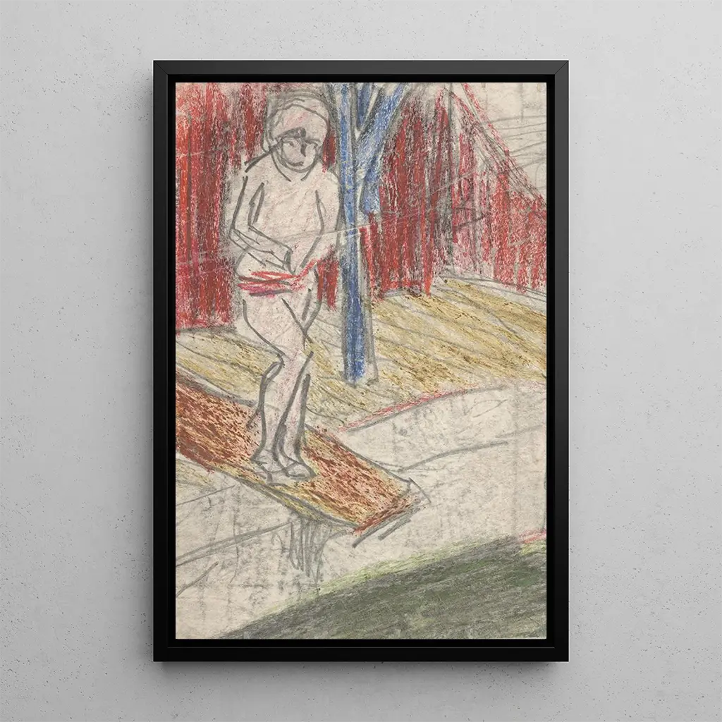 "Figura na trampolinie" Ernsta Ludwiga Kirchnera uchwyca chwilę łaski i napięcia, gdzie sylwetka kobiety wyrasta na tle żywego tła. Kompozycja, naznaczona jaskrawymi kolorami i odważnymi formami, wywołuje zarówno oczekiwanie, jak i wolność. Kirchner potrafi przekazać atmosferę lekkości i ruchu, jednocześnie podkreślając wrażliwość swojego tematu. To dzieło, jednocześnie dynamiczne i kontemplacyjne, zachęca widza do refleksji nad aktem i emocjami mu towarzyszącymi.