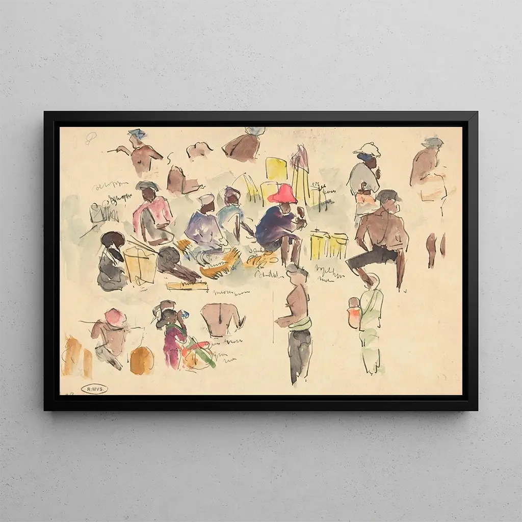 Druk artystyczny "Figures Indigènes" autorstwa Pierre Jean Apol ukazuje bogactwo kolorów i form, które uchwycają istotę życia i tradycji rdzennych ludów. Postacie, ubrane w tradycyjne stroje, zdają się ożywać pod pędzlem artysty, każdy szczegół opowiada unikalną historię. Odcienie ziemi i roślinności harmonijnie się przenikają, tworząc atmosferę jednocześnie żywą i uspokajającą. Dzieło zaprasza widza do zanurzenia się w świat, gdzie natura i ludzkość współistnieją w doskonałej symbiozie, oferując głęboko immersyjne doświadczenie wizualne.