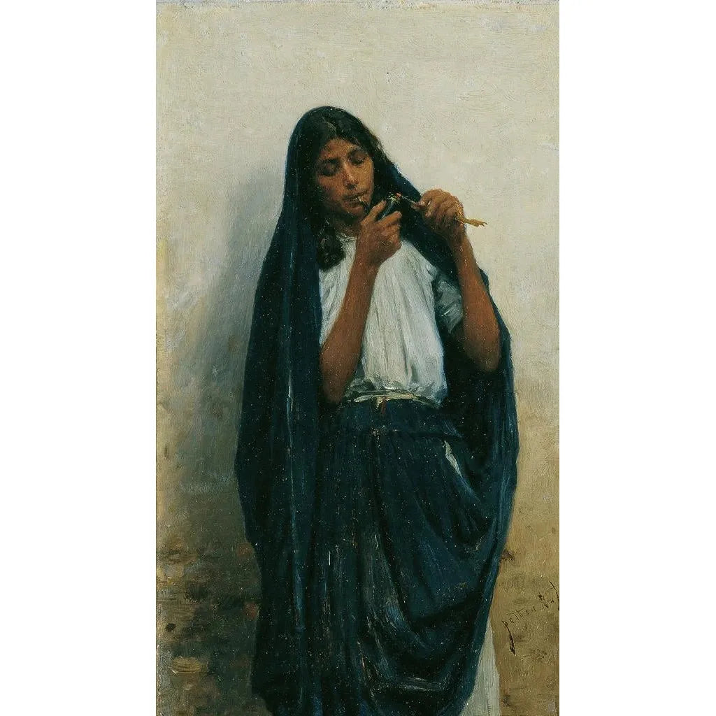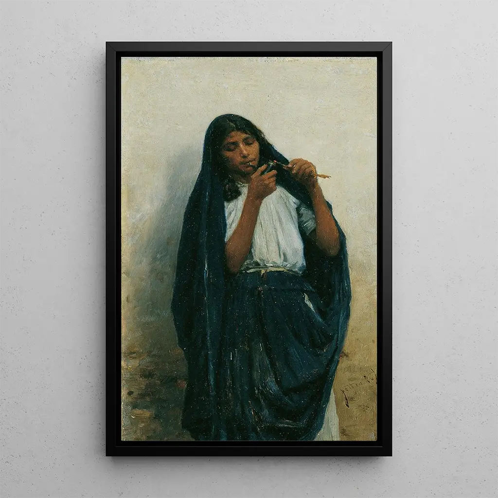 Druk artystyczny dzieła "Gitane" autorstwa Augusta von Pettenkofen doskonale oddaje istotę tańczącej gitany podczas występu. Żywe i ciepłe kolory, takie jak czerwony i złoty, wywołują pasję i żywotność kultury gitany. Technika artysty, łącząca realizm z impresjonistycznymi akcentami, tworzy pulsującą atmosferę, w której ruch wydaje się niemal namacalny. Hipnotyzujący wzrok tancerki, połączony z jej bogato zdobionym kostiumem, natychmiast przyciąga uwagę i zachęca do zanurzenia się w fascynujący świat muzyki i tańca.