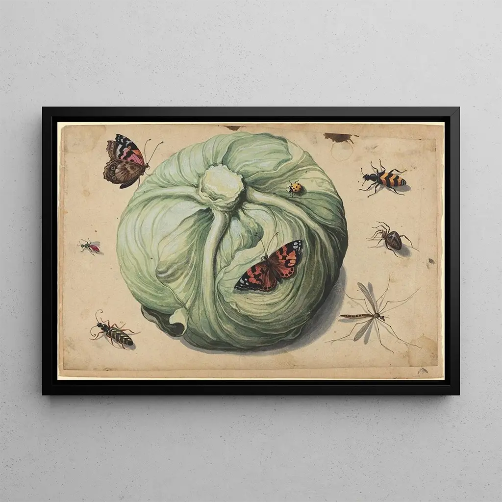Cette œuvre anonyme, probablement réalisée au XVIIIe ou XIXe siècle, témoigne d'une époque où la nature était souvent représentée dans l'art. Les artistes de cette période cherchaient à capturer la beauté du monde naturel, tout en mettant en avant les détails souvent négligés. La 'Tête de chou avec insectes' s'inscrit dans cette tradition, où chaque élément est soigneusement observé et retranscrit. Bien que l'artiste demeure inconnu, cette œuvre nous rappelle l'importance de la nature et de ses petites créatures, souvent oubliées dans notre quotidien.