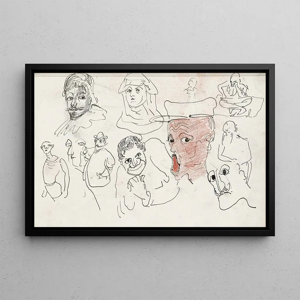 Tęczowe głowy Carel Adolph Lion Cachet to celebracja ludzkiej ekspresji poprzez przesadzone formy i żywe kolory. Każda twarz, z podkreślonymi cechami, wywołuje unikalną osobowość, niemal żywą. Technika artysty, łącząca akwarelę i tusz, tworzy zabawną i dynamiczną atmosferę, zachęcając widza do eksplorowania emocji i historii za każdą karykaturą. Kompozycja, często asymetryczna, wzmacnia ideę ruchu i żywotności, zamieniając każde dzieło w tętniącą życiem scenę.