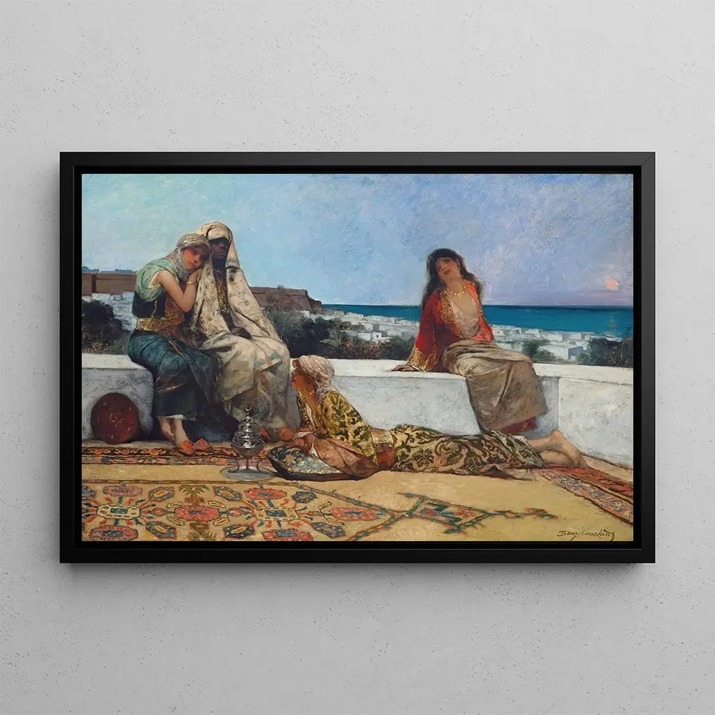 Druk artystyczny "Godziny zmierzchu" autorstwa Jean-Joseph Benjamin-Constant to dzieło, które przywołuje magię chwil przejścia między dniem a nocą. Ciepłe, złote kolory mieszają się z ciemniejszymi odcieniami, tworząc uderzający kontrast, który przyciąga wzrok. Technika oleju na płótnie pozwala uchwycić światło w niemal namacalny sposób, ożywiając postacie i ich otoczenie. Atmosfera emanująca z tego obrazu jest jednocześnie melancholijna i marzycielska, zachęcając widza do zanurzenia się w tym ulotnym momencie, gdy czas zdaje się zawiesić.