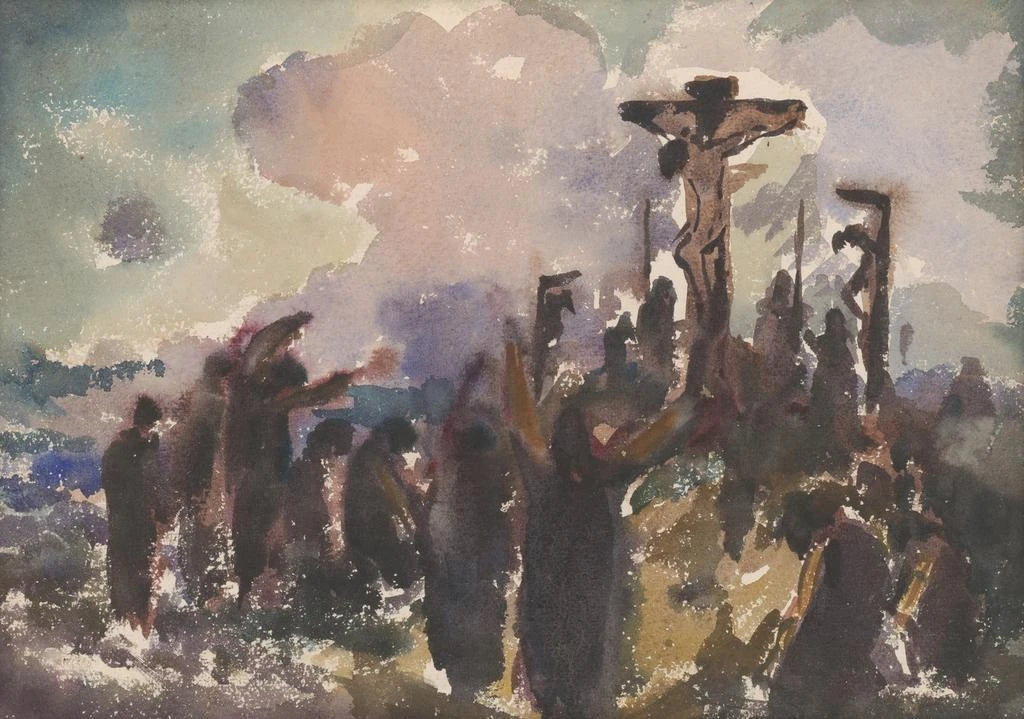 La reproduction de Golgotha de Zolo Palugyay évoque une atmosphère poignante, où la lumière et l'ombre se mêlent pour créer une intensité dramatique. Les couleurs sombres, dominées par des teintes de gris et de rouge, renforcent le poids émotionnel de la scène. La technique de l'artiste, qui mêle le réalisme à une touche d'expressionnisme, permet de ressentir la douleur et la souffrance des personnages représentés. Chaque détail, des visages marqués par l'angoisse aux éléments du décor, contribue à une immersion totale dans ce moment tragique, invitant le spectateur à une réflexion profonde sur la condition humaine.