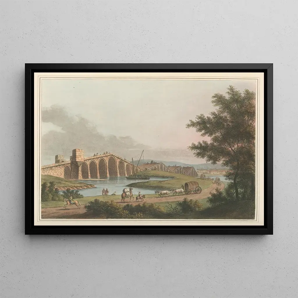 Druk artystyczny Grand pont autorstwa Luigi Mayer przenosi nas do świata, w którym architektura łączy się z naturą. Delikatne odcienie niebieskiego i zielonego, połączone z akcentami złotego światła, tworzą atmosferę zarówno spokojną, jak i majestatyczną. Technika malarstwa olejnego używana przez Mayer pozwala na precyzyjne oddanie szczegółów struktur, jednocześnie wprowadzając pewną poezję do sceny. Ten obraz zachęca do kontemplacji, gdzie każdy element wydaje się opowiadać historię, a most staje się symbolem przejścia między dwoma światami.