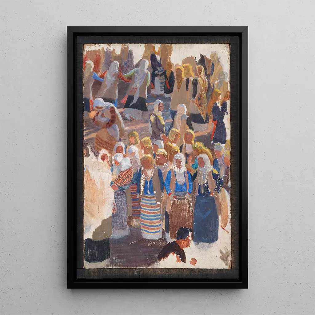 Druk artystyczny Grupy tańczących kobiet Megara autorstwa Niels Skovgaard przedstawia żywą scenę, na której kilka kobiet bierze udział w zbiorowym tańcu. Płynne i zsynchronizowane ruchy tancerek tworzą fascynującą dynamikę, podczas gdy jaskrawe kolory, od czerwieni po zieleń, wprowadzają zaraźliwą energię do dzieła. Technika Skovgaarda, łącząca realizm z impresjonistycznymi akcentami, pozwala odczuć radość i ekscytację tego świątecznego momentu. Każda twarz, każdy gest jest starannie oddany, zachęcając widza do zanurzenia się w świat tańca.
