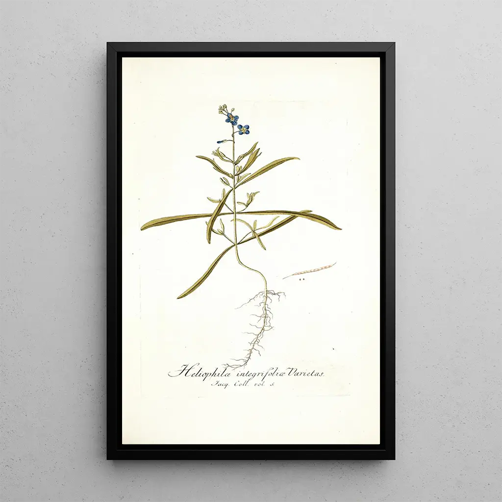 Druk artystyczny Heliophila integrifolia przenosi nas do żywego świata, w którym natura wyraża się z blaskiem. Żywe kolory tego obrazu, od odcieni niebieskiego po jaskrawą żółć, przywołują ciepło słońca i świeżość pełnego kwitnienia ogrodu. Technika malarska używana przez Nikolausa Josefa Freiherr von Jacquina, z delikatnymi i precyzyjnymi pociągnięciami pędzla, tworzy atmosferę zarówno uspokajającą, jak i dynamiczną. Każdy płatek zdaje się łapać światło, zapraszając widza do zagłębienia się w szczegóły tego kwiatowego dzieła.