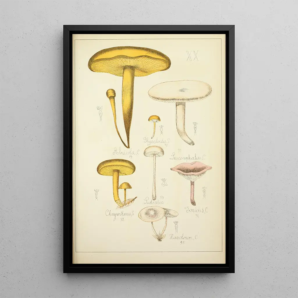 La druk artystyczny Histoire naturelle des champignons Pl20 de Guillaume Sicard nous transporte dans un monde où la diversité des champignons est mise en lumière. Ce tableau, riche en couleurs et en textures, présente une variété impressionnante d'espèces, chacune capturée avec une précision remarquable. Les nuances vibrantes et les détails minutieux créent une atmosphère à la fois vivante et apaisante, invitant le spectateur à explorer les merveilles de la nature. La technique de l’aquarelle, utilisée avec maestria, souligne la délicatesse et la beauté éphémère de ces organismes fascinants, offrant une véritable ode à la mycologie.