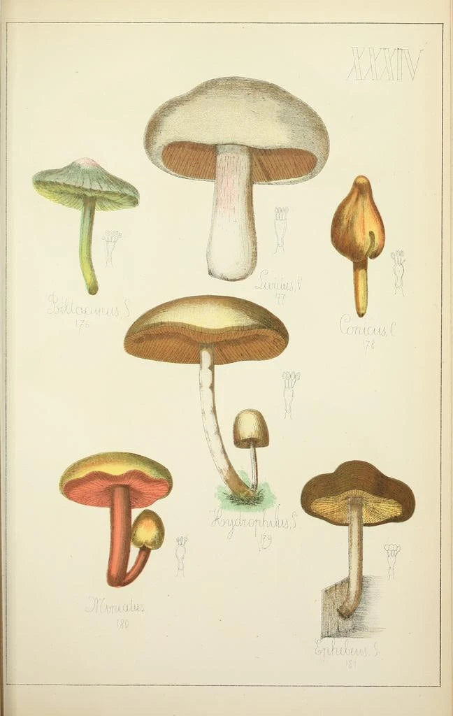 Histoire naturelle des champignons Pl34 : une symphonie de formes et de couleurs