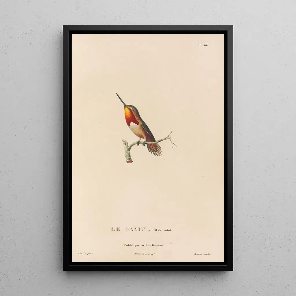 Druk artystyczny Histoire naturelle des oiseaux-mouches Pl67 to żywe dzieło, które celebruje piękno i różnorodność ptaków-mouche. Jaskrawe kolory, od szmaragdowej zieleni po jasne żółcie, harmonijnie się łączą, tworząc żywą i radosną atmosferę. Technika ryciny używana przez René Primevère Lesson pozwala na precyzyjne uchwycenie delikatnych szczegółów piór i postaw ptaków. Każdy element kompozycji zdaje się ożywać, zapraszając widza do zanurzenia się w świat, gdzie natura wyraża się z nieskończoną gracją.