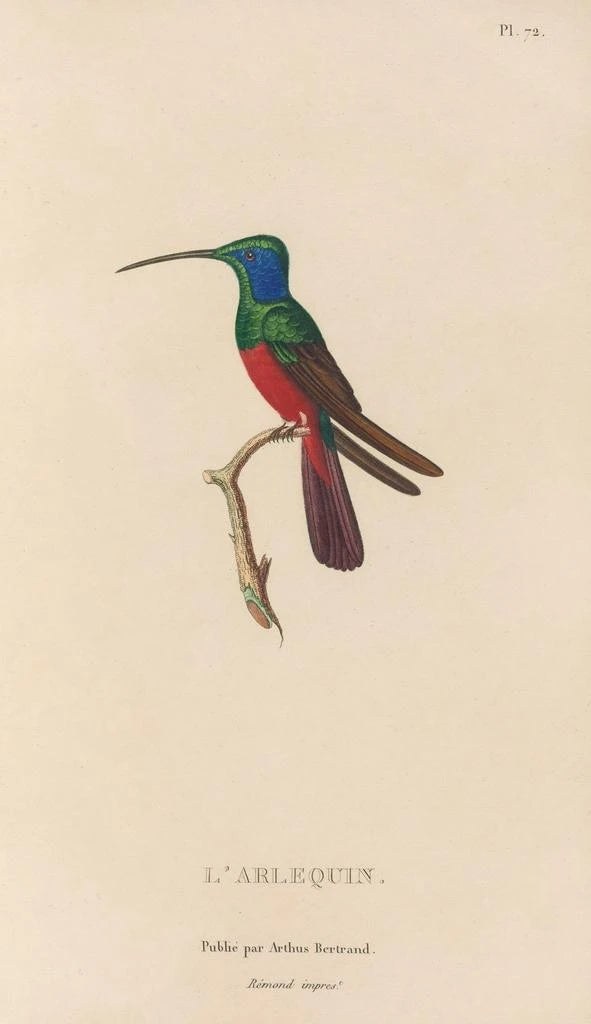 L'œuvre "Histoire naturelle des oiseaux-mouches Pl73" de René Primevère Lesson nous plonge dans un univers vibrant où la nature se dévoile avec éclat. Les couleurs éclatantes des plumages des oiseaux-mouches, allant du vert émeraude au bleu cobalt, captivent le regard et évoquent une sensation de légèreté. La technique de gravure utilisée par Lesson permet de rendre chaque détail avec une précision remarquable, faisant ressortir la délicatesse des plumes et la grâce des poses des oiseaux. Cette toile invite à une contemplation attentive, révélant la beauté fugace de ces créatures fascinantes, véritables joyaux de la biodiversité.