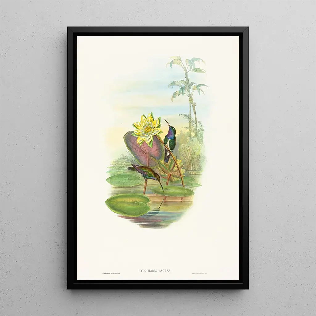John Gould, brytyjski przyrodnik i ilustrator XIX wieku, jest uznawany za jednego z najwybitniejszych ornitologów swojego czasu. Jego pasja do ptaków skłoniła go do podróży po całym świecie, zbierania okazów i tworzenia ilustracji o niezwykłej precyzji. Pod wpływem naukowych odkryć swojego czasu, Gould umiejętnie łączył sztukę i naukę, oddając hołd różnorodności ptasiej fauny. Jego dzieła, w tym druk artystyczny Hylocharis lactea, stały się odniesieniami w dziedzinie ornitologii, świadcząc o jego zaangażowaniu w dokumentowanie piękna natury.