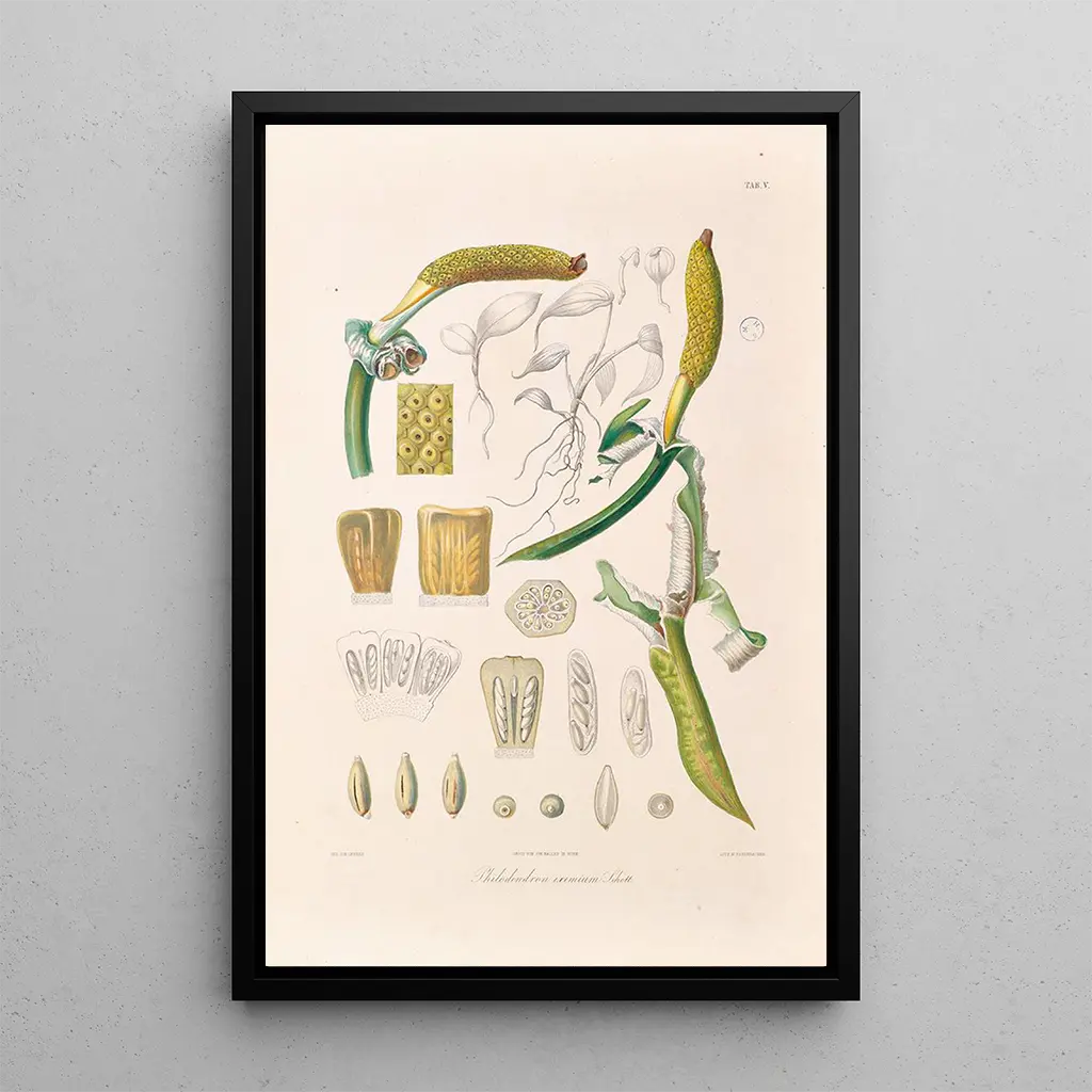 Druk artystyczny Icones Aroidearum Pl05 jest celebracją bogactwa i różnorodności roślin aroideus. To urzekające dzieło przedstawia różnorodność form i kolorów, gdzie każdy szczegół jest starannie wyeksponowany. Żywe odcienie i delikatne niuanse liści i kwiatów tworzą atmosferę harmonii i witalności. Technika graweru używana przez Schotta zapewnia głębię wizualną, która przyciąga wzrok i zachęca do dokładnego badania każdego elementu. To płótno jest znacznie więcej niż zwykłą ilustracją botaniczną; jest prawdziwym hołdem dla piękna natury.