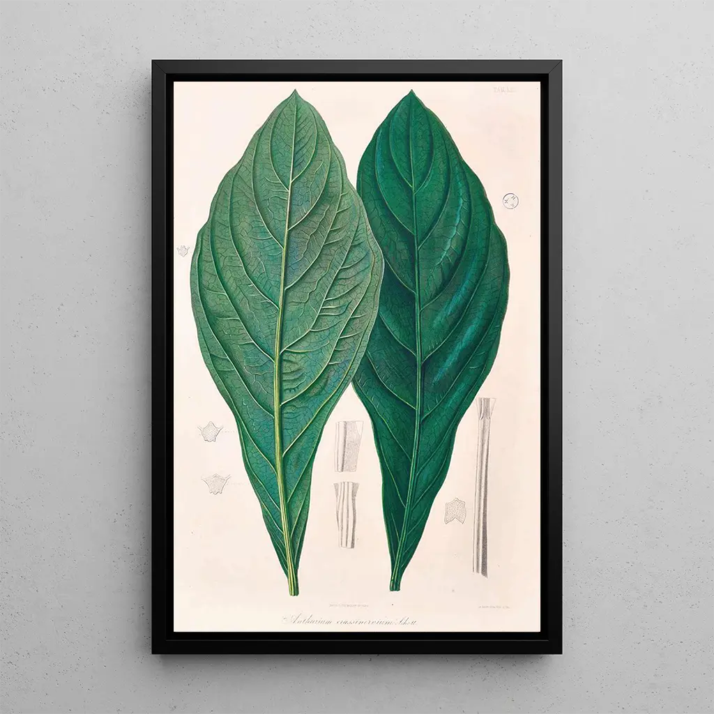Druk artystyczny "Icones Aroidearum Pl12" autorstwa Heinricha Wilhelma Schotta jest prawdziwym hołdem dla bogactwa i różnorodności roślin aroideowych. Dzięki drobiazgowym szczegółom i żywym kolorom, Schott potrafi uchwycić istotę tych fascynujących gatunków. Odcienie zieleni, żółci i fioletu harmonijnie się przenikają, tworząc atmosferę jednocześnie żywą i uspokajającą. Każdy liść i każda kwiatostan są przedstawione z niezwykłą precyzją, zachęcając widza do uważnej kontemplacji cudów natury. Ten druk artystyczny to coś więcej niż zwykła ilustracja botaniczna; on przywołuje bujny świat, w którym każda roślina opowiada swoją historię.