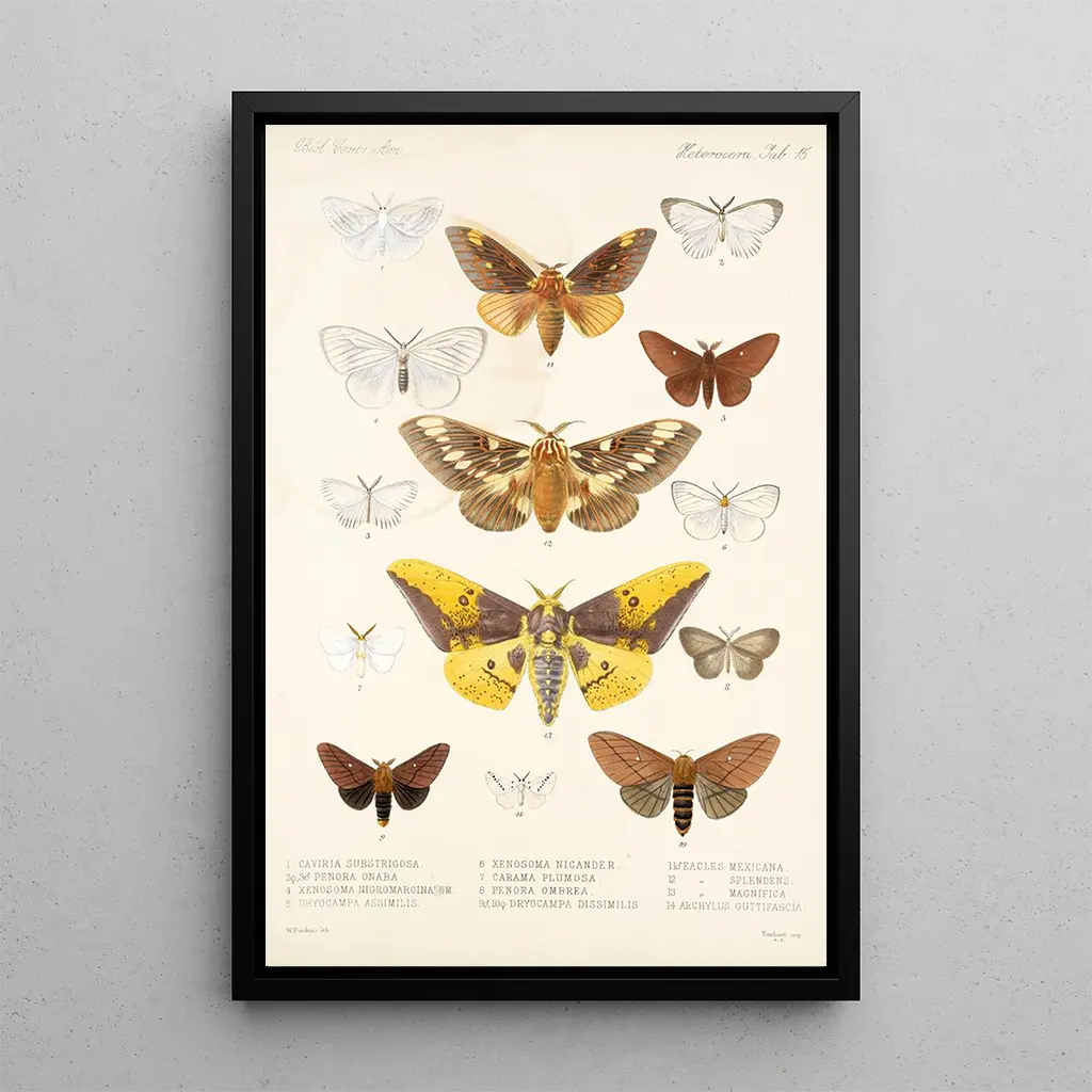"Insecta Lepidoptera Heterocera Pl 015" autor Frederick DuCane Godman to fascynujące dzieło ukazujące różnorodność nocnych motyli. Poprzez tę druk artystyczny, Godman przedstawia z niezwykłą precyzją okazy o jaskrawych kolorach i delikatnych wzorach. Odmiany zieleni, fioletu i pomarańczu harmonijnie się przenikają, tworząc atmosferę zarazem tajemniczą, jak i urzekającą. Technika akwareli, stosowana z dbałością, pozwala uchwycić lekkość i kruchość skrzydeł, zachęcając widza do podziwiania efemerycznej piękności tych stworzeń.