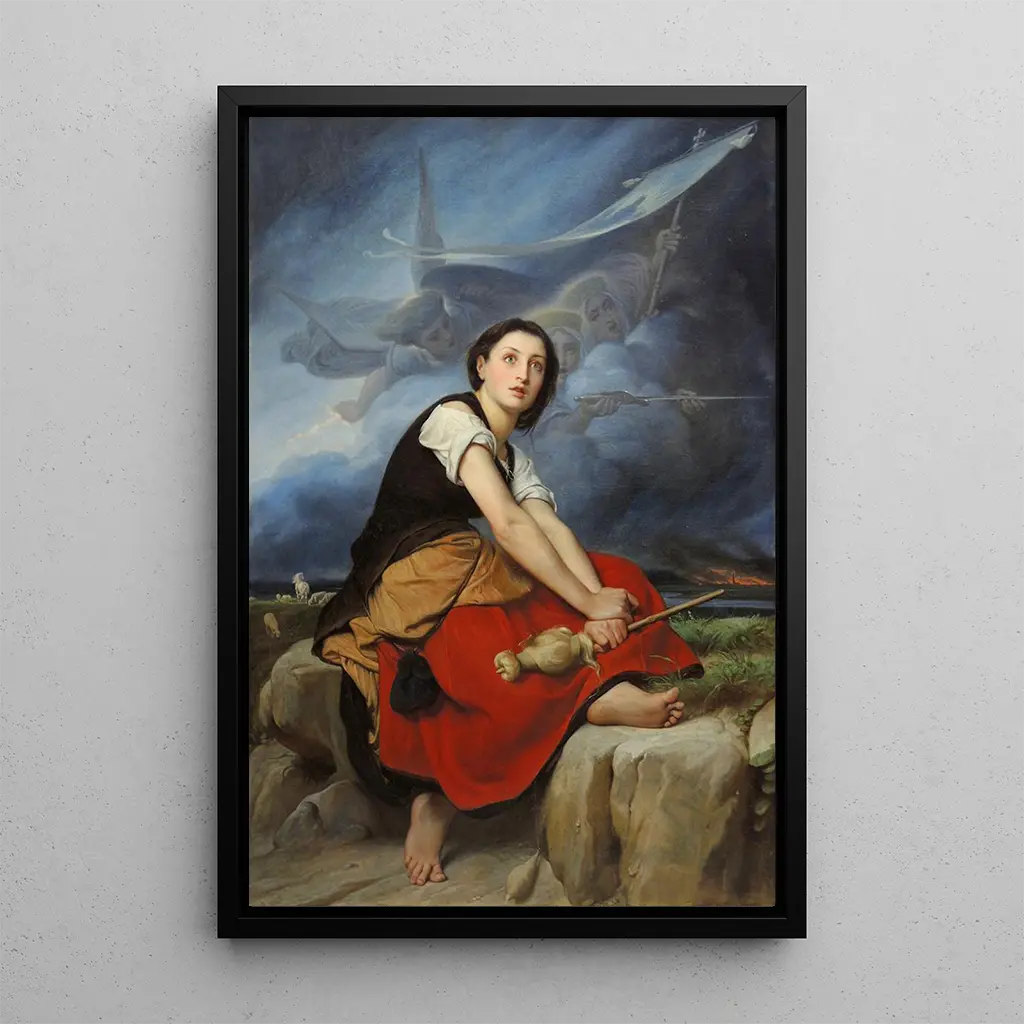 W tym ikonicznym dziele François-Léon Benouville ukazuje kluczowy moment z życia Jeanne d'Arc, gdy młoda bohaterka, targana wizjami, zdaje się zawieszona między światem ziemskim a boskim. Bogate kolory i drobiazgowe detale płótna tworzą mistyczną atmosferę, podkreśloną przez delikatne światło oświetlające twarz Jeanne. Kompozycja, skoncentrowana na jej skupionym wyrazie twarzy, zachęca widza do odczuwania głębi jej duchowego zaangażowania. Artysta potrafi przekazać namacalną emocję, czyniąc ten druk artystyczny "Jeanne d'Arc słuchająca swoich głosów" nie tylko obrazem, lecz prawdziwym doświadczeniem kontemplacyjnym.