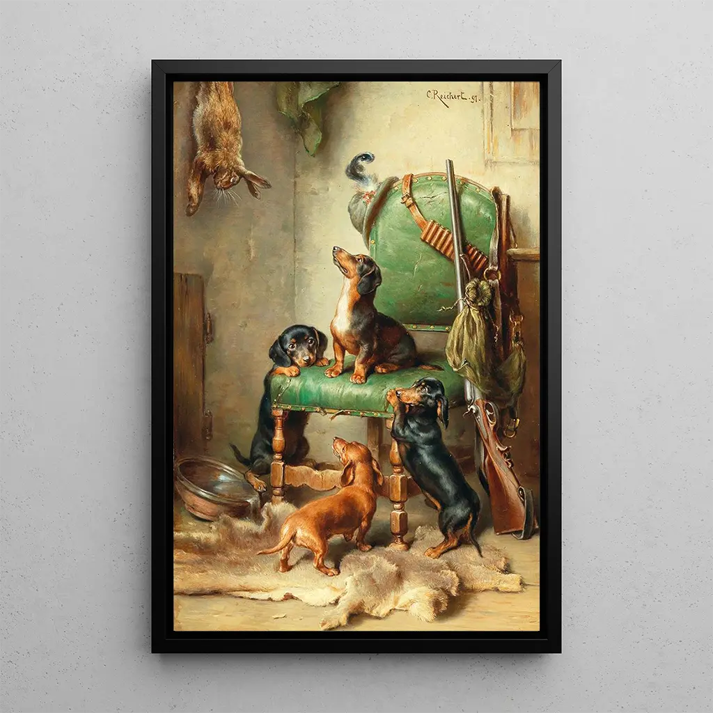 Carl Reichert, austriacki malarz XIX wieku, jest znany z umiejętności uchwycenia istoty zwierząt w ich naturalnym środowisku. Pod wpływem romantyzmu, wpisuje się w artystyczną tradycję, która ceni naturę i ludzkie emocje. Jego dzieła, często pełne realizmu, świadczą o drobiazgowej obserwacji i głębokiej empatii wobec przedstawianych stworzeń. W trakcie swojej kariery Reichert zdołał wyrobić sobie wybitną pozycję w świecie sztuki zwierząt, pozostawiając trwałe dziedzictwo, które nadal inspiruje współczesnych artystów.