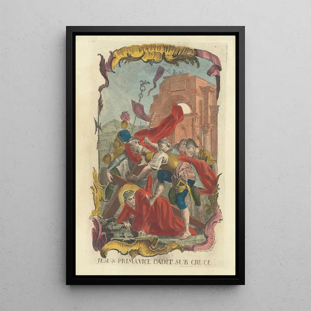 W tym poruszającym wydruku artystycznym Jezus, przygnębiony ciężarem krzyża, upada na ziemię. Ciemne, ziemiste kolory wywołują atmosferę rozpaczy, podczas gdy akcenty światła podkreślają cierpienie Chrystusa. Dynamiczna kompozycja, z postaciami otaczającymi wyrażającymi współczucie i niepokój, kieruje wzrok ku centrum dzieła. Technika malarska, łącząca realizm i ekspresjonizm, pozwala odczuć intensywność tego tragicznego momentu, w którym wiara i cierpienie spotykają się w tragicznej tańcu.