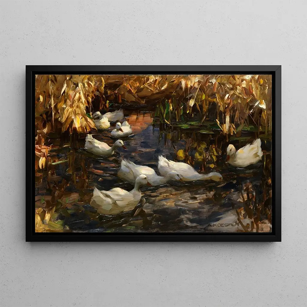 Druk artystyczny Canards au Bord de l'Étang autorstwa Alexandra Koestera przenosi nas do żywego obrazu, w którym natura rozkwita. Kaczki, spokojnie spoczywające na wodzie, otoczone są bujną roślinnością, odzwierciedlającą spokojne piękno stawu. Ciepłe, ziemiste kolory, połączone z akcentami zieleni, tworzą kojący nastrój, podczas gdy delikatne światło poranka oświetla scenę. Koester, posługując się stylem realistycznym, potrafi uchwycić nie tylko wygląd zwierząt, ale także esencję zawieszonego w czasie momentu, zachęcając do kontemplacji natury.