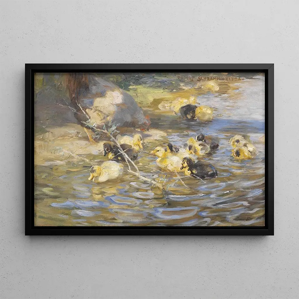 La druk artystyczny Canards nous plonge dans un tableau vivant, où la nature s'épanouit sous le pinceau de Rudolf Schramm-Zittau. Les canards, représentés dans toute leur splendeur, évoluent dans un environnement aquatique serein, entourés de végétation luxuriante. Les couleurs vives et les détails délicats capturent l'essence de la faune, créant une atmosphère paisible et joyeuse. Chaque coup de pinceau semble insuffler une vie nouvelle à ces oiseaux, invitant le spectateur à apprécier la beauté simple de la nature.