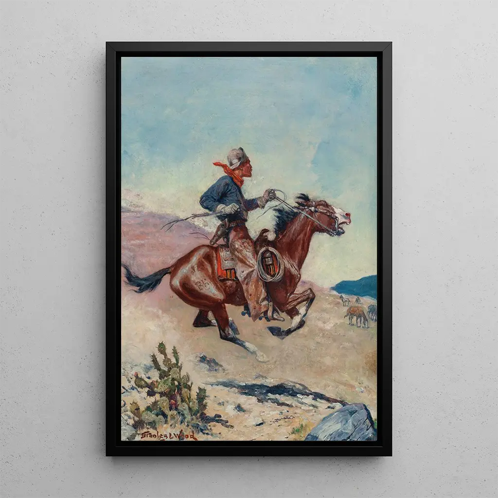 Stanley Llewellyn Wood, peintre britannique actif à la fin du XIXe siècle, est reconnu pour ses œuvres qui célèbrent l'Ouest américain et ses légendes. Influencé par les récits de l'époque, il a su capturer la grandeur des paysages et l'esprit indomptable des personnages qui les habitent. Ses œuvres, souvent inspirées par des événements historiques, témoignent d'une époque où le Pony Express symbolisait la rapidité et l'audace dans la communication. Wood a su s'imposer comme un artiste important de son temps, mêlant réalisme et romantisme pour donner vie à des scènes emblématiques de l'histoire américaine.