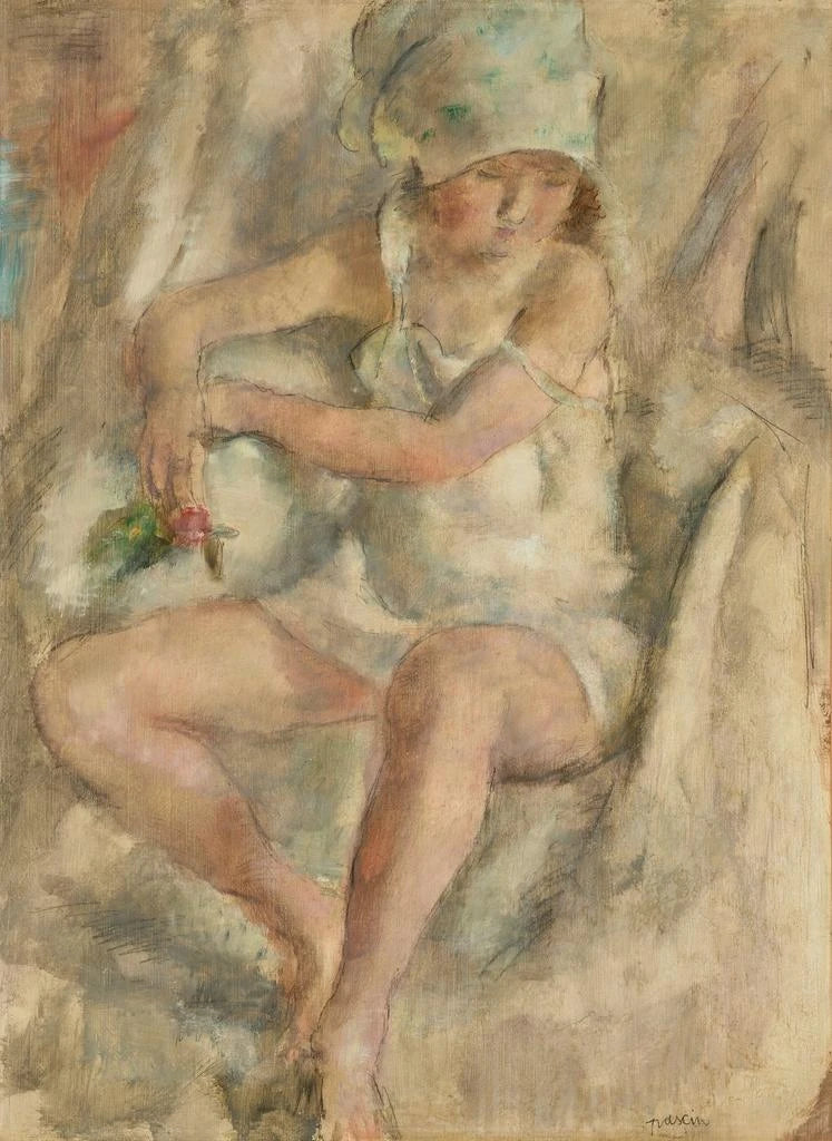 Jules Pascin, artysta pochodzenia bułgarskiego, zaznaczył początek XX wieku swoim unikalnym stylem, łączącym wpływy europejskie i amerykańskie. Działając w środowisku artystycznym Montmartre, wyłamał się jako jeden z prekursorów modernizmu, eksplorując tematy takie jak nocne życie i kondycja kobieca. Jego dzieła, często pełne melancholii i zmysłowości, odzwierciedlają poszukiwanie tożsamości i emocji. "Femme au turban avec rose" doskonale ilustruje jego talent do uchwycenia efemerycznej piękności i złożoności kobiet jego epoki.