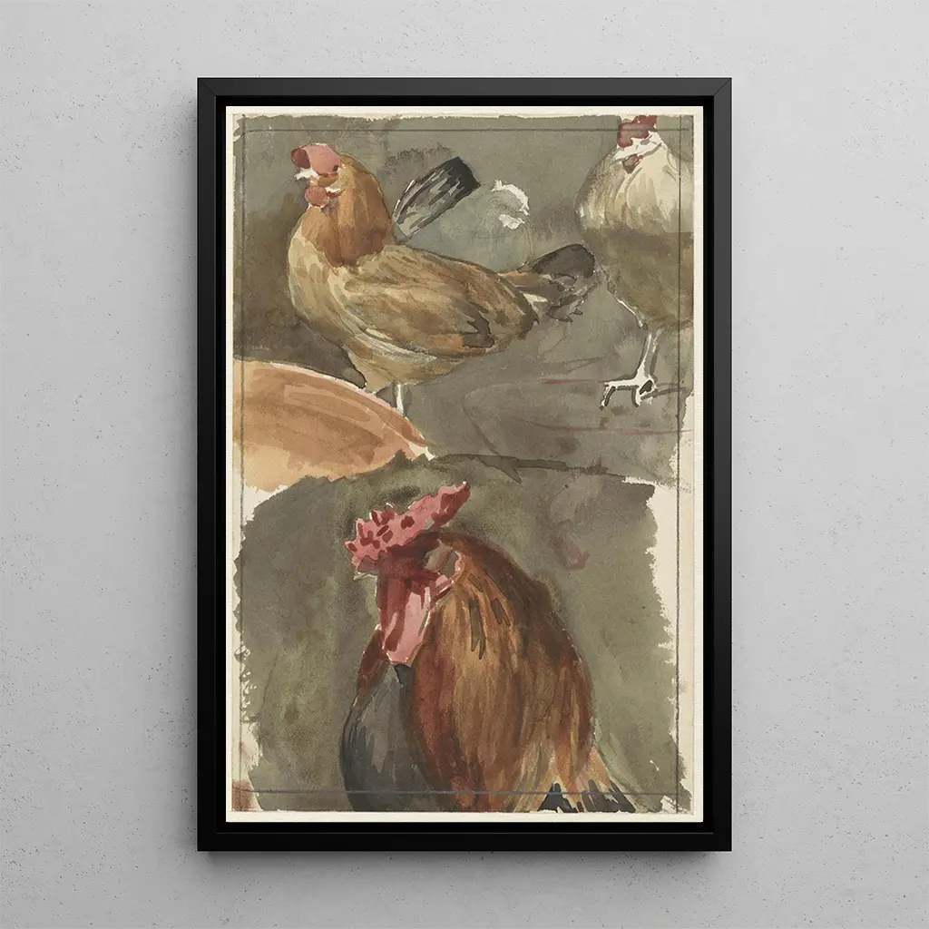 W tej reprodukcji obrazu Coq avec poules, Jan Veth uchwycił istotę życia na wsi. Ciepłe, ziemiste kolory, od głębokich brązów po jaskrawe żółcie, wprowadzają żywą i radosną atmosferę. Kompozycja podkreśla majestatycznego koguta, otoczonego kurami, tworząc dynamikę ruchu i interakcji. Technika Vetha, łącząca realizm z impresjonistycznymi akcentami, ożywia każdą piórko i każdy źdźbło trawy, przenosząc widza w moment spokoju i prostoty.