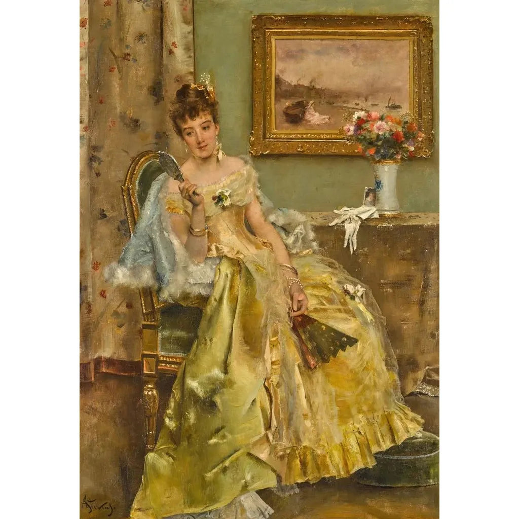 "Coquetterie" to druk artystyczny autorstwa Alfreda Stevensa, który celebruje piękno i elegancję kobiecą poprzez portret wyrafinowanej kobiety. Kompozycja, bogata w detale, podkreśla tekstury ubrań i delikatne odcienie kolorów, tworząc intymną i wyrafinowaną atmosferę. Miękko oświetlona twarz bohaterki podkreśla jej urok i grację, podczas gdy jej fascynujące spojrzenie wydaje się zapraszać widza do dzielenia się chwilą bliskości. Ta płótno nawiązuje do epoki, w której moda i kobiecość były w centrum artystycznych zainteresowań.