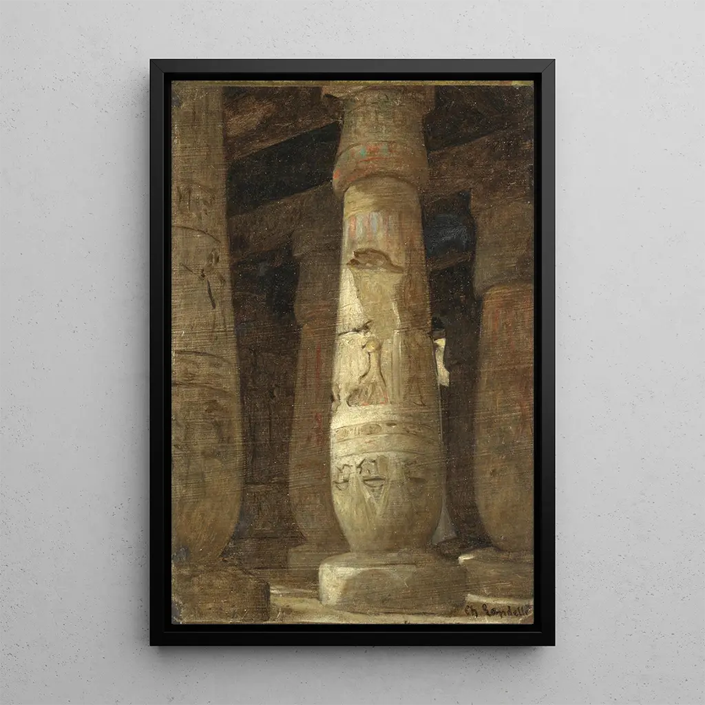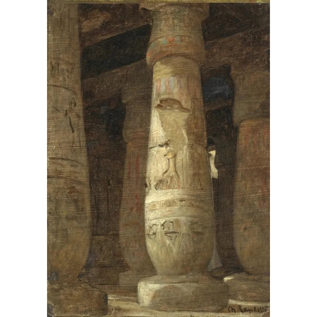 Druk artystyczny kolumny egipskiej autorstwa Charlesa Landelle'a nawiązuje do wielkości i majestatu architektury starożytnego Egiptu. To dzieło przedstawia kolumnę ozdobioną motywami hieroglifów i szczegółami rzeźbiarskimi, świadczącymi o wyjątkowym kunszcie rzemieślników tamtej epoki. Złote i ochrowe odcienie, połączone z delikatnymi cieniami, tworzą atmosferę zarówno podniosłą, jak i fascynującą. Artysta zdołał uchwycić istotę minionej epoki, zapraszając widza do wyobrażenia sobie historii i rytuałów, które rozgrywały się wokół tych monumentów.