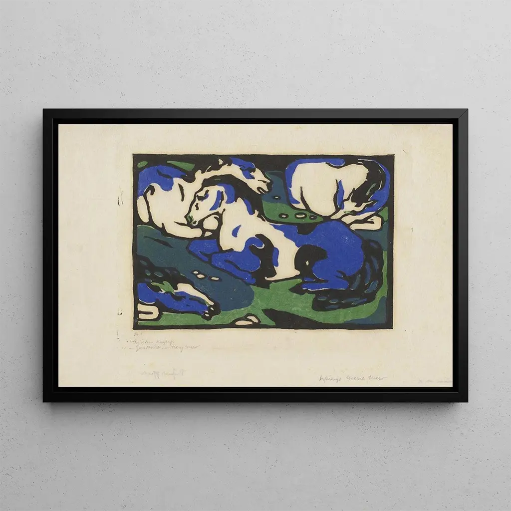 "Chevaux au Repos", ikoniczne dzieło Franza Marca, uchwyca istotę harmonii między zwierzęciem a naturą. Konie, przedstawione w jaskrawych odcieniach niebieskiego, żółtego i czerwonego, zdają się rozkwitać na marzycielskim krajobrazie. Technika Marca, charakteryzująca się stylizowanymi formami i odważnymi kolorami, tworzy atmosferę jednocześnie dynamiczną i spokojną. To płótno wywołuje moment spokoju, w którym konie, symbole siły i wolności, odpoczywają w ciszy, oferując widzowi uspokajające i kontemplacyjne wrażenie.