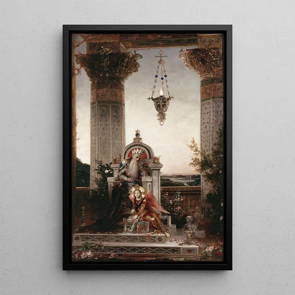 W "Le king Dawid" Gustave Moreau uchwycił wielkość i złożoność ikonicznej postaci biblijnej. Kompozycja jest bogata w symbolikę, z głębokimi kolorami i drobiazgowymi detalami podkreślającymi szlachetność króla. Moreau używa wyrafinowanej techniki, łącząc elementy realistyczne z nutami wyobraźni, tworząc atmosferę jednocześnie uroczystą i mistyczną. Przenikliwe spojrzenie Dawida, otoczone motywami kwiatowymi i luksusowymi draperiami, wywołuje spokojną siłę, zachęcając widza do refleksji nad naturą władzy i wiary.