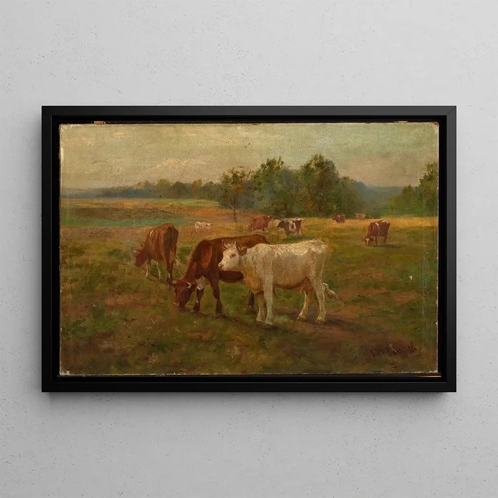 W tej reprodukcji dzieła "Vaches" Edward Mitchell Bannister przenosi nas w wiejski pejzaż, gdzie panuje harmonia. Delikatne i ciepłe odcienie, łączące zielenie i brązy, przywołują na myśl słoneczny dzień na wsi. Impresjonistyczna technika Bannistera objawia się subtelnymi pociągnięciami pędzla, tworząc niemal marzycielską atmosferę. Krowy, spokojnie rozproszone po polu, zdają się symbolizować harmonię między człowiekiem a naturą, zachęcając widza do uspokajającej kontemplacji.