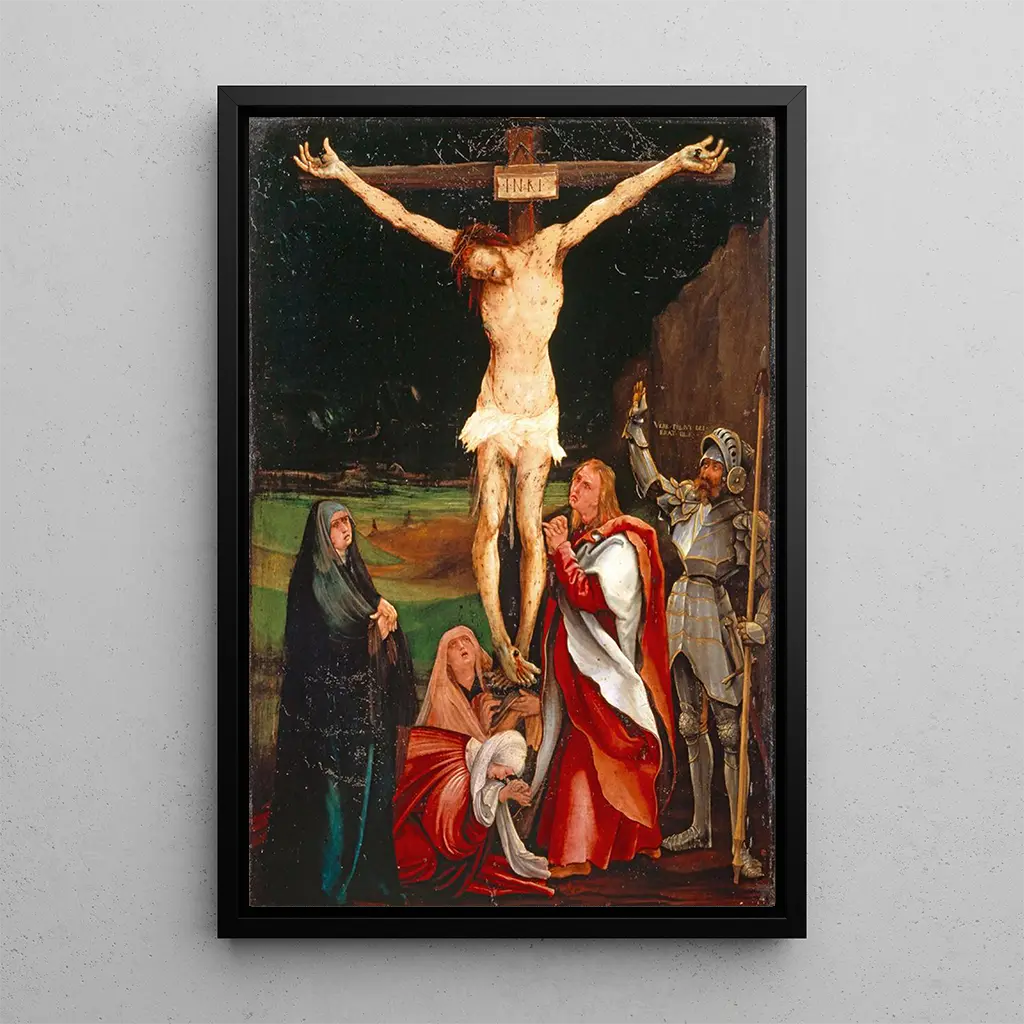 „La Crucifixion” autorstwa Matthiasa Grünewalda to wybitne dzieło, które ukazuje cierpienie i transcendencję męki Chrystusa. Ciemne kolory i uderzające kontrasty tworzą atmosferę dramatycznego napięcia, gdzie każdy szczegół jest pełen emocji. Kompozycja, skoncentrowana na postaci Chrystusa, natychmiast przyciąga wzrok i zachęca do medytacji. Wyrazy twarzy postaci, od rozpaczy po pełne oddania, wzmacniają wizualny wpływ tej sceny biblijnej. Technika Grünewalda, charakteryzująca się odważnym użyciem światła i cienia, nadaje tej reprodukcji duchową głębię, której nie da się porównać.
