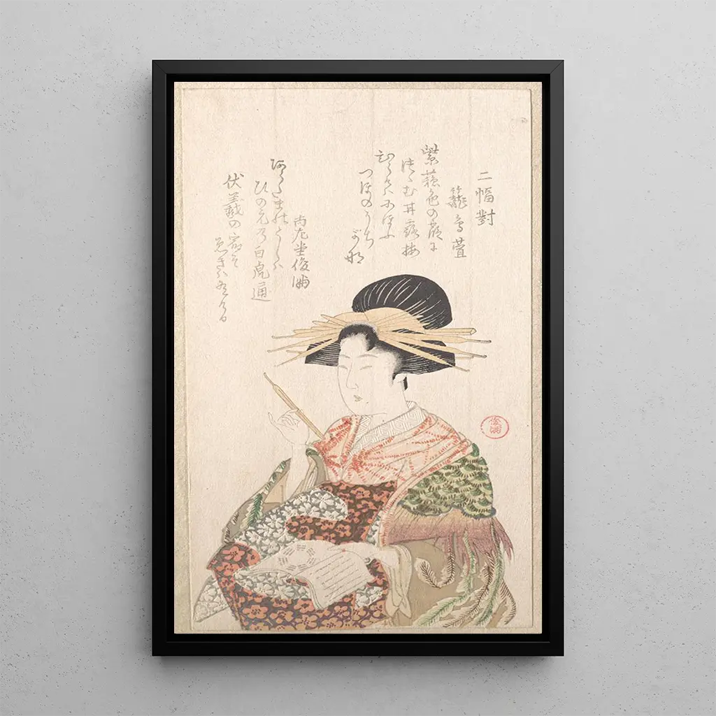 Courtisane z książką i spinką do włosów: ponadczasowa elegancja W reprodukcji "Courtisane z książką i spinką do włosów" Kubo Shunman ukazuje scenę pełną gracji i tajemniczości. Kurtyzana, delikatnie ustawiona, trzyma książkę, która wydaje się skrywać sekrety i opowieści. Żywe kolory i wyrafinowane wzory jej kostiumu przyciągają wzrok, podczas gdy blask spinki do włosów dodaje odrobiny wyrafinowania. Technika druku artystycznego, z jej drobiazgowymi detalami, pozwala odczuć intymną i poetycką atmosferę tego dzieła. Ta reprezentacja podkreśla piękno i intelekt kobiet tamtej epoki, jednocześnie oferując okno do minionego świata. Kubo Shunman: ikoniczny artysta ukiyo-e Kubo Shunman, wybitna postać sztuki ukiyo-e, odcisnął piętno na XVIII wieku swoimi wyrafinowanymi i sugestywnymi dziełami. Jego styl wyróżnia się szczególną dbałością o detale i paletą żywych kolorów. Pod wpływem ówczesnych nurtów artystycznych, Shunman umiejętnie wplatał elementy natury i codziennego życia w swoje kreacje. Jego przedstawienia kurtyzan, często idealizowane, świadczą o znaczeniu tych postaci w kulturze japońskiej. Twórczość Shunmana to nie tylko odzwierciedlenie jego talentu, ale także świadectwo rozwoju japońskiej sztuki w tamtym okresie. Dekoracyjny nabytek o wielu zaletach Reprodukcja "Courtisane z książką i spinką do włosów" stanowi cenny dodatek do Twojej dekoracji wnętrza. Niezależnie od tego, czy w salonie, biurze czy sypialni, ten obraz wnosi odrobinę elegancji i wyrafinowania. Jakość druku i wierne odwzorowanie oryginalnych dzieł gwarantują niezaprzeczalny walor estetyczny. Wkomponowując tę płótno w swoją przestrzeń, tworzysz ciepłą i przyjazną atmosferę, jednocześnie oddając hołd tradycyjnej japońskiej sztuce. To dzieło, zarówno dekoracyjne, jak i pełne historii, z pewnością zachwyci Twoich gości i wzbogaci Twoją kolekcję sztuki.