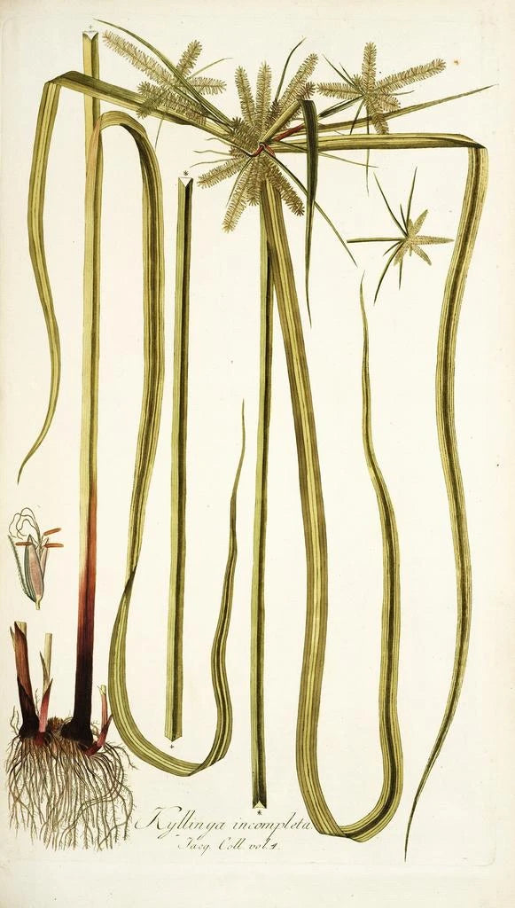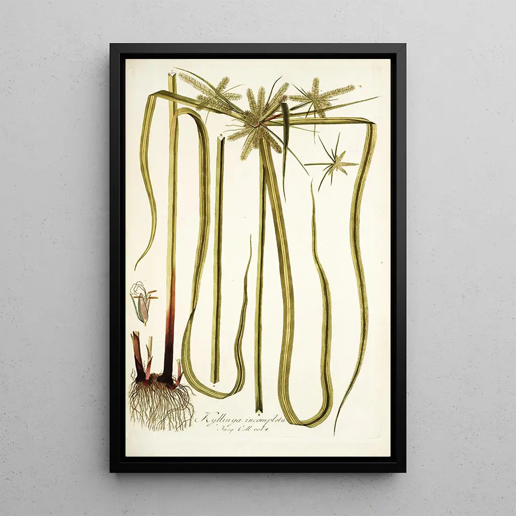 Kylinga incompleta, ikoniczne dzieło Nikolausa Josepha Freiherr von Jacquina, uchwyca istotę egzotycznej flory z niezrównaną delikatnością. Żywe kolory tego druku artystycznego przywołują bogactwo krajobrazów tropikalnych, gdzie każdy szczegół jest starannie odwzorowany. Technika akwareli, stosowana przez Jacquina, nadaje płótnu lekkość i płynność, pozwalając formom organicznym rozkwitać na papierze. Atmosfera emanująca z tego dzieła jest zarówno spokojna, jak i fascynująca, zachęcając widza do zanurzenia się w bujnym świecie roślinności.