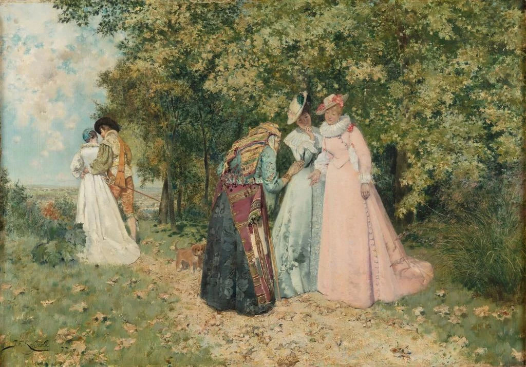 „La bonne aventure” Jean François Raffaëlli uchwyca z finezją scenę z życia paryskiego, gdzie nadzieja i ciekawość splatają się w intymnym otoczeniu. Ziemiste kolory i akcenty światła tworzą ciepłą atmosferę, podczas gdy postacie, zamrożone w momencie wymiany, zdają się opowiadać historię. Technika Raffaëlli, łącząca realizm z impresjonizmem, pozwala uchwycić istotę chwili, czyniąc ten obraz szczególnie żywym. Każdy szczegół, od wyrazu twarzy po gesty rąk, przyczynia się do zanurzenia w codzienność paryżan.