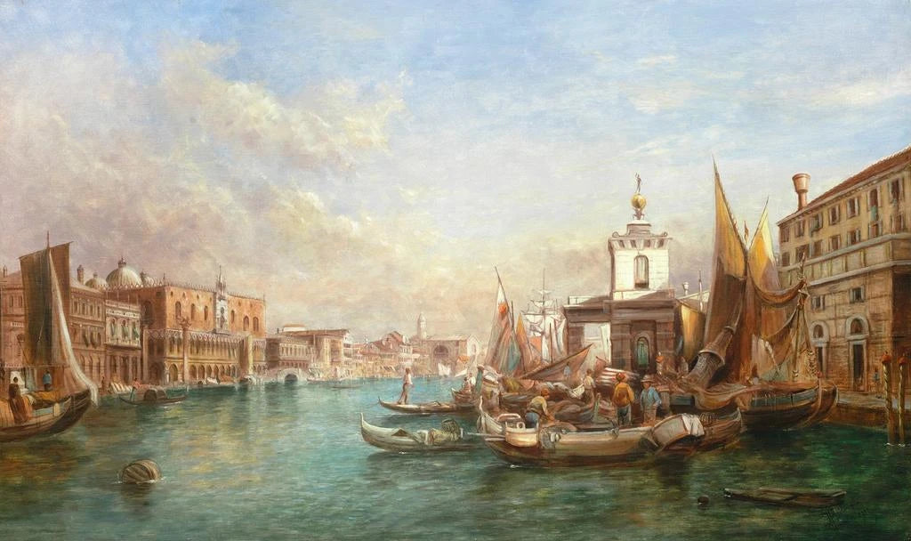 Alfred Pollentine, aktywny w drugiej połowie XIX wieku, jest znany z pejzaży weneckich i scenek rodzajowych. Pod wpływem ruchu prerafaelitów, wpisuje się w artystyczną tradycję, która ceni naturę i światło. Jego dzieła, często naznaczone romantyzmem, świadczą o epoce, gdy Anglia i Włochy wymieniały się kulturą. Pollentine potrafił uchwycić esencję Wenecji, czyniąc swoje obrazy oknami na żywą, kolorową rzeczywistość, zachowując jednocześnie nutę poezji.