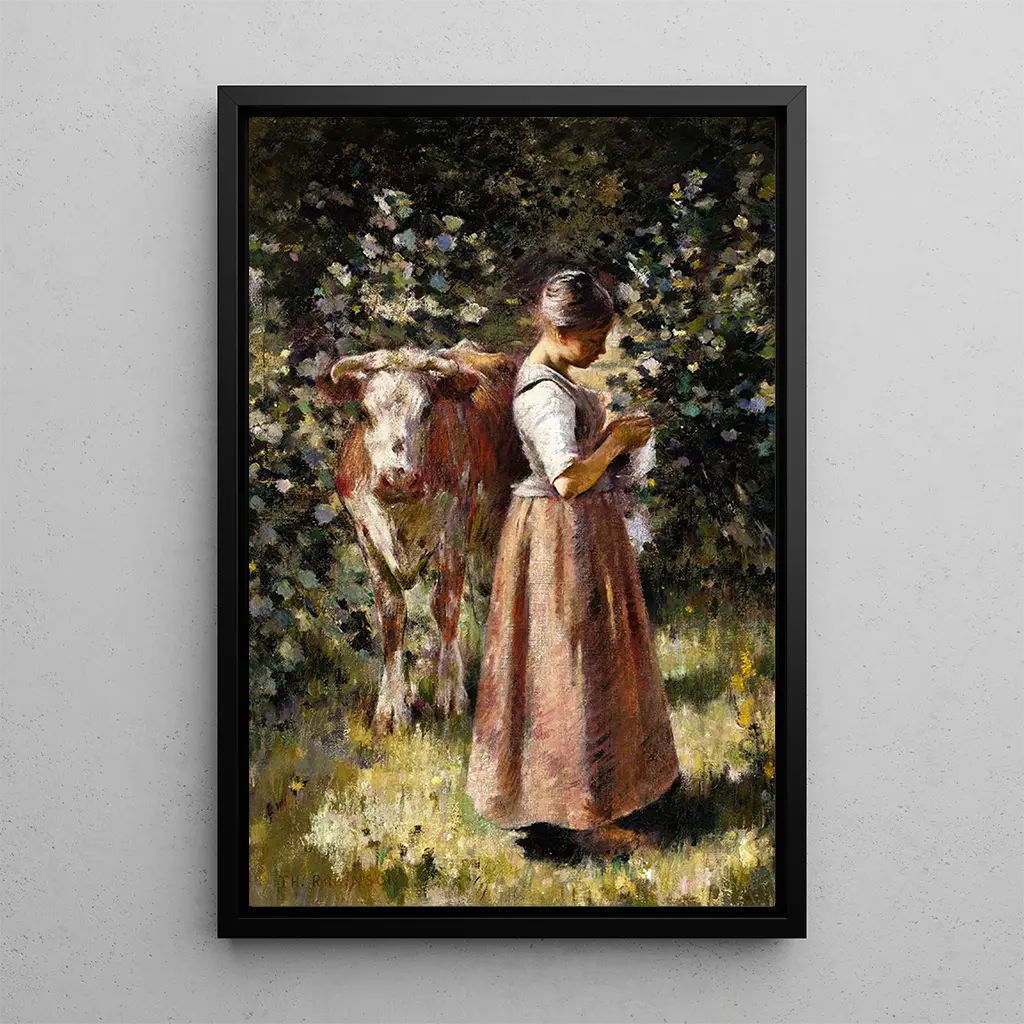 W "La vachère" Theodore Robinson uchwycił istotę sceny bucolicznej pełnej spokoju. Kompozycja przedstawia młodą kobietę, ubraną w prostą sukienkę, która opiekuje się krową na zielonym pejzażu. Delikatne i naturalne kolory, od jaskrawych zieleni po ciepłe brązy, tworzą kojący nastrój. Impresjonistyczna technika Robinsona, charakteryzująca się płynnymi pociągnięciami pędzla i subtelnym światłem, ożywia tę codzienną scenę, zapraszając widza do odczuwania spokoju wiejskiej okolicy. Ta płótno nie tylko oddaje piękno natury, ale także prostotę i harmonię życia na wsi.