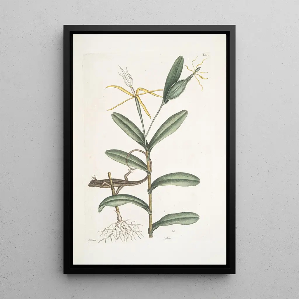 La reproduction de Lacertus griseus, également connu sous le nom de lézard lion, est une œuvre captivante qui attire le regard par ses teintes vibrantes et son réalisme saisissant. Mark Catesby, en utilisant des techniques d’aquarelle, parvient à capturer la texture de la peau de l’animal ainsi que les nuances délicates de son environnement. L’atmosphère de cette toile évoque une immersion dans la nature, où chaque détail, des écailles aux feuillages environnants, semble vivant. Cette œuvre est une véritable ode à la biodiversité, invitant à la contemplation et à l’émerveillement face à la beauté du monde animal.
